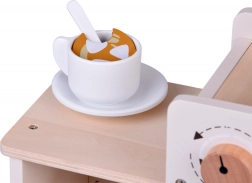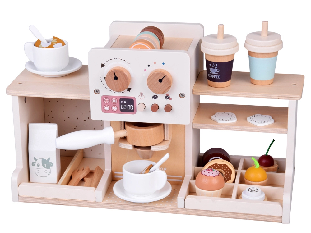 Le manopole girevoli, le icone stampate e il portafiltro creano la sensazione di una vera preparazione del caffè. I bambini possono inserire capsule in legno e “impostare” la bevanda ideale.