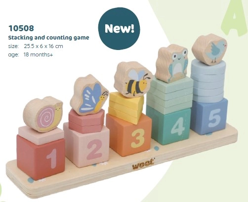 - Impilamento, classificazione per colori e forme, apprendimento del conteggio 1–5