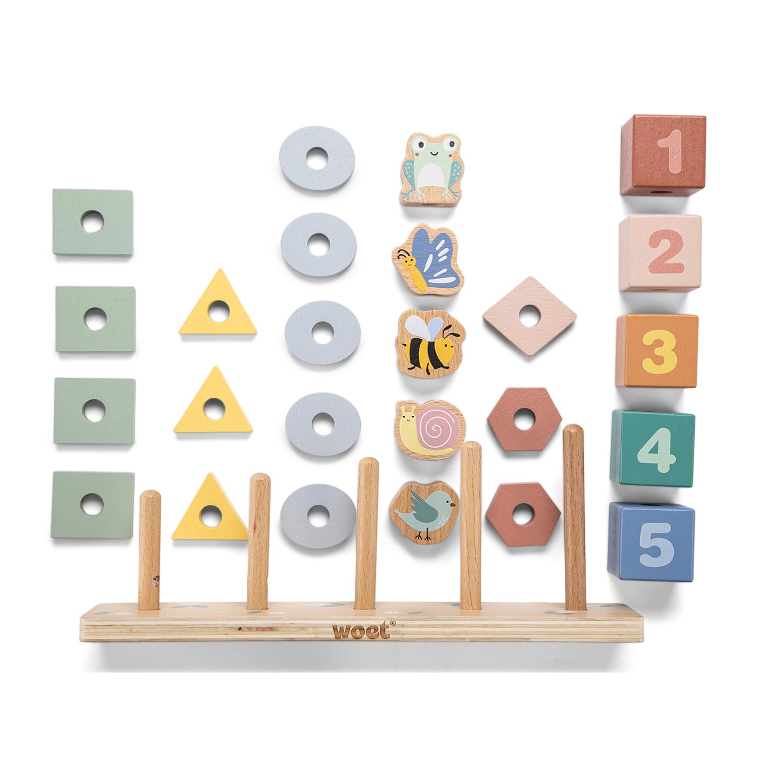 - Base in legno con 5 pioli, 5 blocchi numerici, 15 anelli impilabili, 5 figure di animali in legno