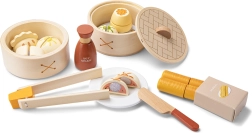Questo set dim sum in legno porta in cameretta l’autentica atmosfera della cucina asiatica. I bambini possono “cuocere al vapore” i raviolini nei cestini impilabili, servirli sul piatto e insaporirli con la “salsa di soia”. Le bacchette e il coltello aiutano ad allenare la presa, la coordinazione e l’abilità manuale.