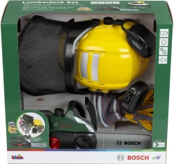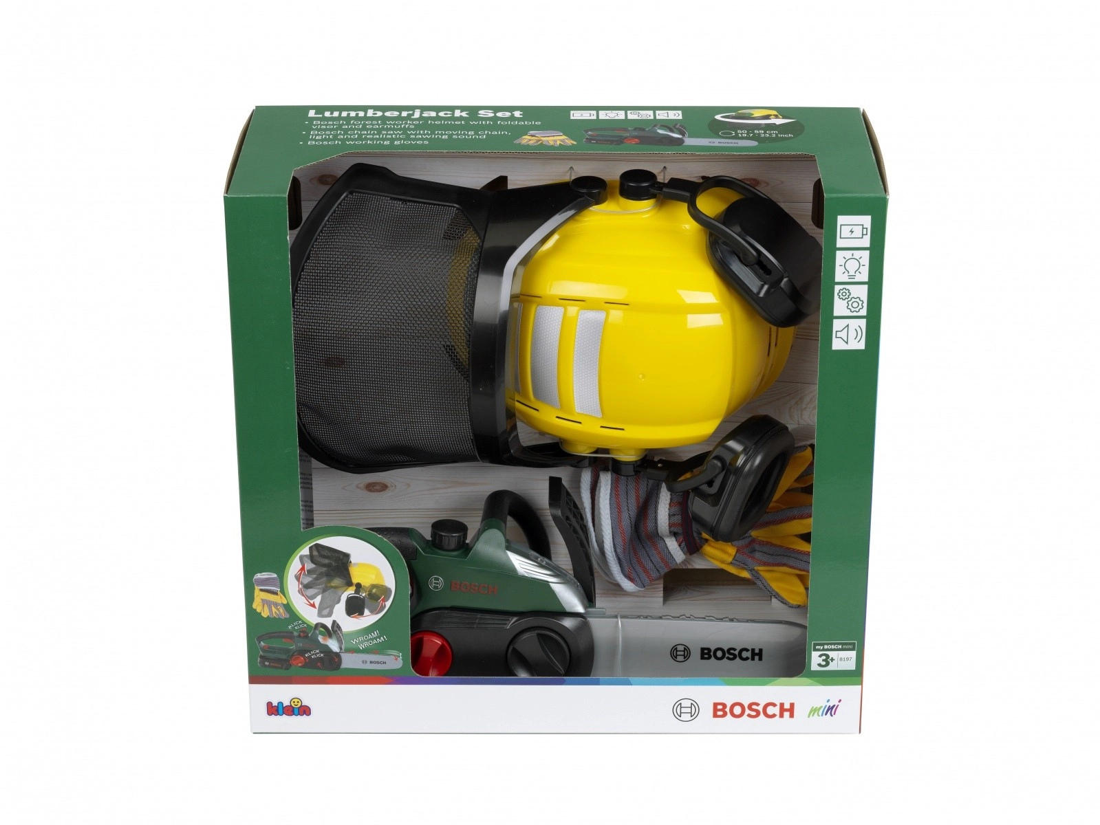 Il set da boscaiolo BOSCH per bambini è progettato per un gioco sicuro e stimolante. La motosega elettronica, dopo il montaggio della barra, emette un autentico suono di taglio e un luce lampeggiante di accompagnamento che simula il funzionamento di un vero attrezzo. Il casco regolabile con visiera e “cuffie” integrate aumenta il realismo e insegna ai bambini le basi della sicurezza.