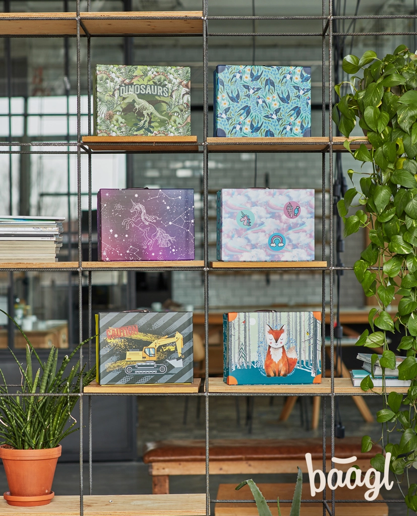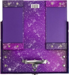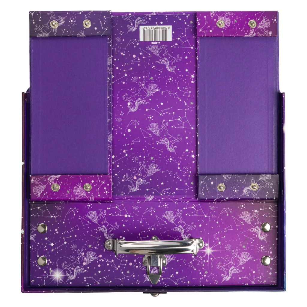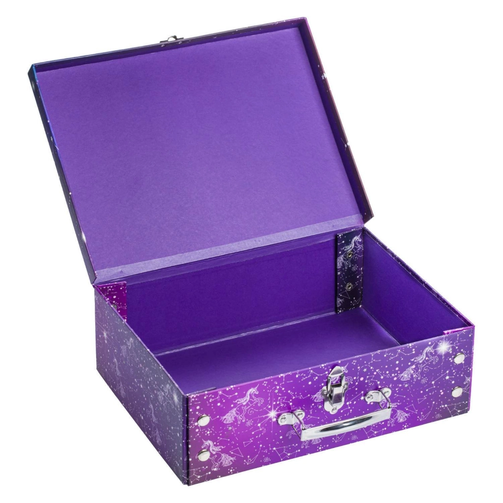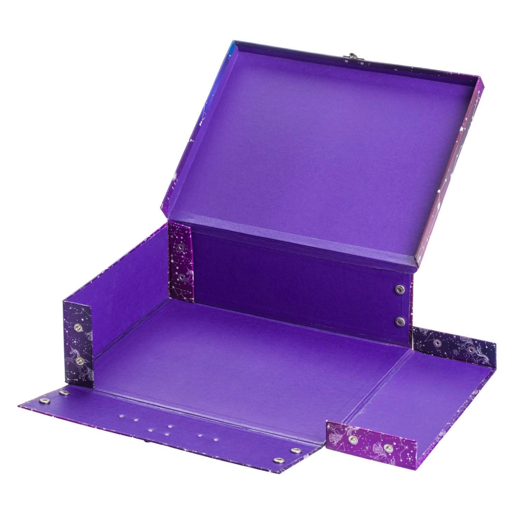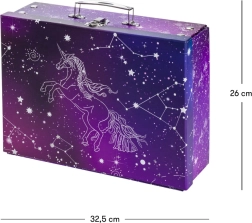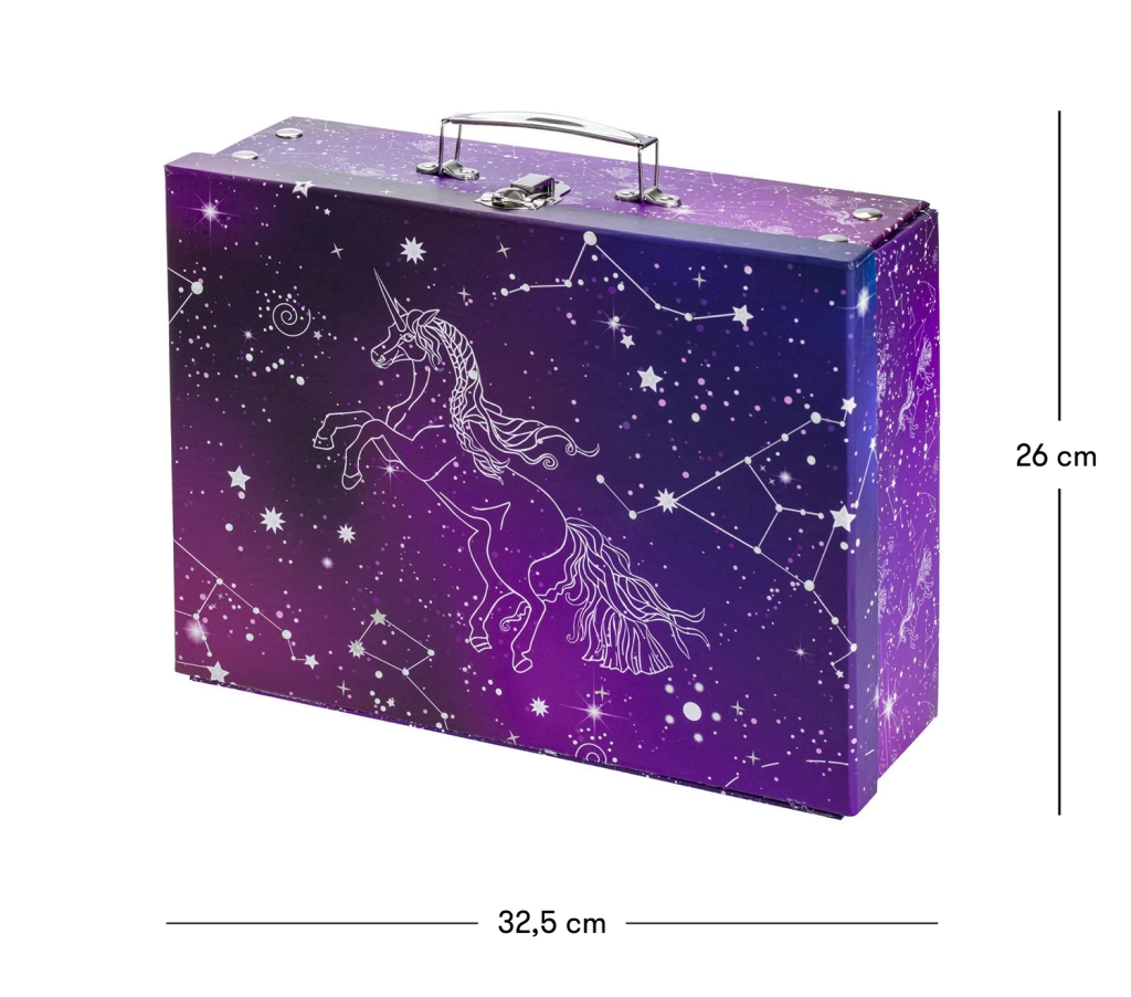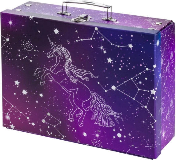 Pratica e stilosa valigetta scolastica Baagl con motivo Unicorn Universe in robusta carta laminata. Grazie al design pieghevole con bottoni a pressione si apre e si richiude facilmente, ha una maniglia in metallo e una chiusura di sicurezza con fibbia – ideale per trasportare materiali artistici, quaderni o piccoli oggetti.