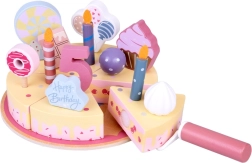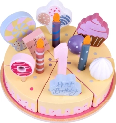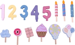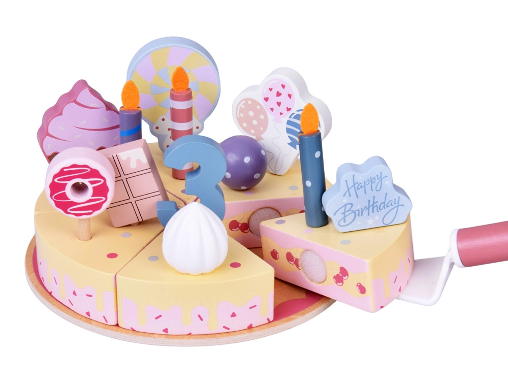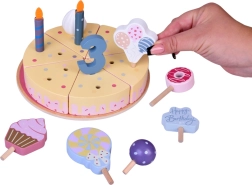 Prepara la tua festa di compleanno! La torta in legno è composta da 6 fette che si possono “tagliare” e riassemblare, e decorare con candeline, numeri e dolcetti intercambiabili. Il set è ideale per giocare insieme, imparare i colori, contare e allenare il servire con gentilezza.