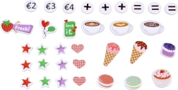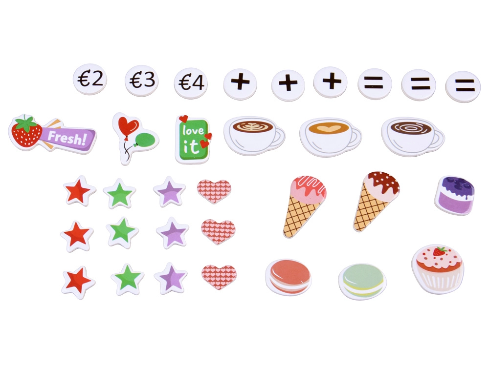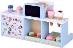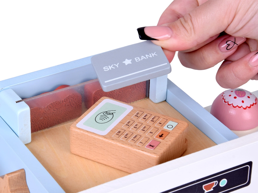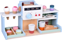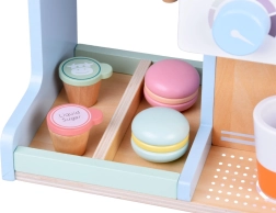 Incluso un variegato set di accessori: bicchierini, piattini, cucchiaini e pinzette, gelati in cono in legno, cupcake, macaron e biscotti, oltre a latte e sciroppo, espositori per presentare le golosità e terminale di pagamento con carta per giocare alla cassa. Ogni pezzo è piacevolmente liscio e adatto alle piccole manine.