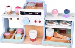 Questa caffetteria e banco gelati in legno dal design pastello è ideale per piccoli baristi e pasticceri. I bambini possono preparare caffè, tè e servire dessert grazie a manopole girevoli, pulsanti, beccuccio per le bevande e pratiche mensoline e scomparti per gli accessori. La cura costruttiva in legno di qualità e i colori atossici garantiscono un gioco sicuro e duraturo.