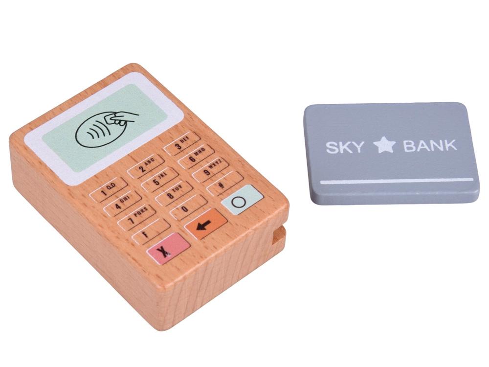 Inclusi terminale di pagamento in legno e carta per il “tap” contactless. Un accessorio perfetto per i giochi di ruolo tra venditore e cliente.
