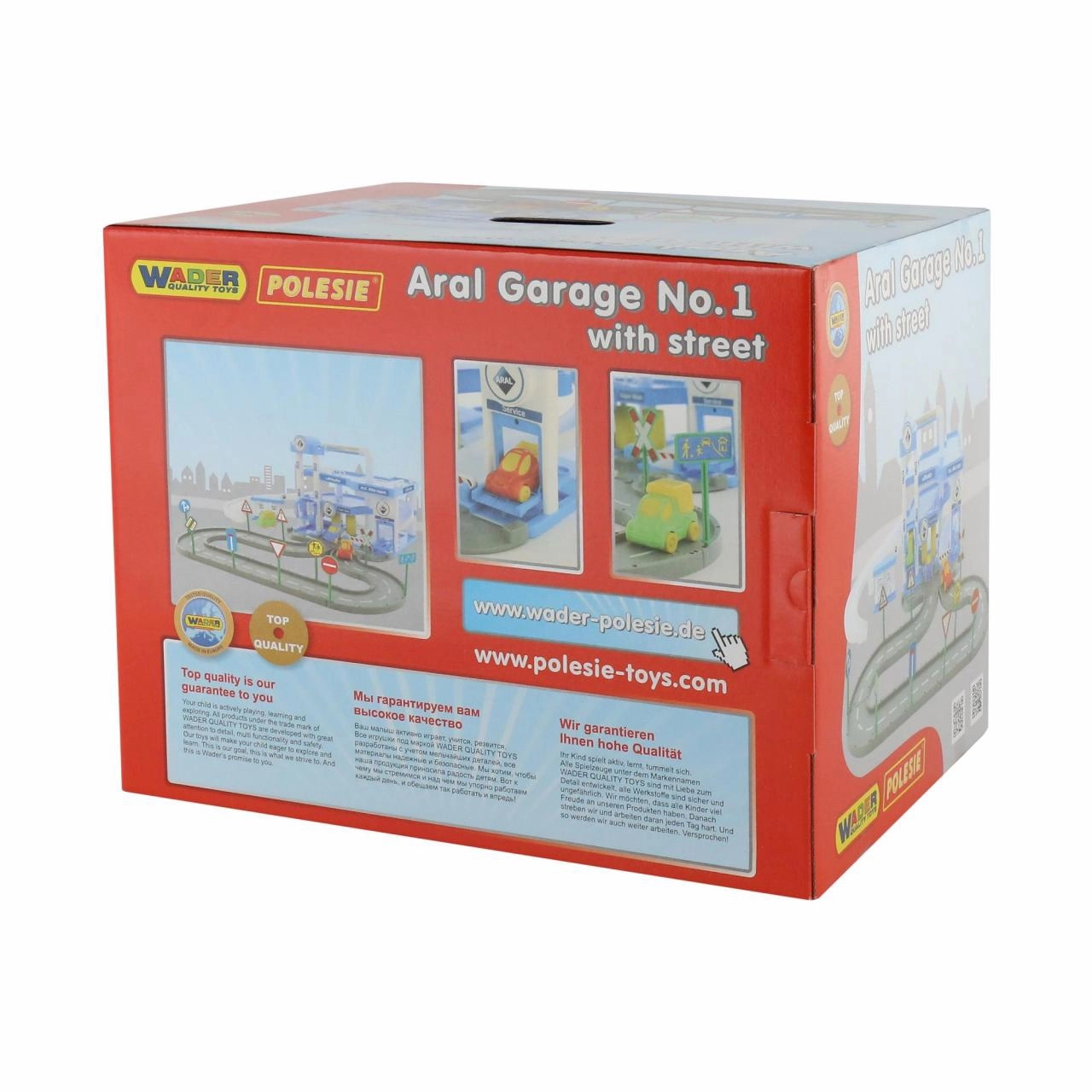 Il garage per bambini ARAL a tre piani offre ore di divertimento per i piccoli appassionati di auto. Dispone di un ascensore meccanico funzionante, stazione di servizio e autolavaggio ed è fornito con 3 automobiline colorate. L’alta qualità Wader Quality Toys e il set completo di adesivi e segnali stradali garantiscono un aspetto accattivante e una lunga durata.