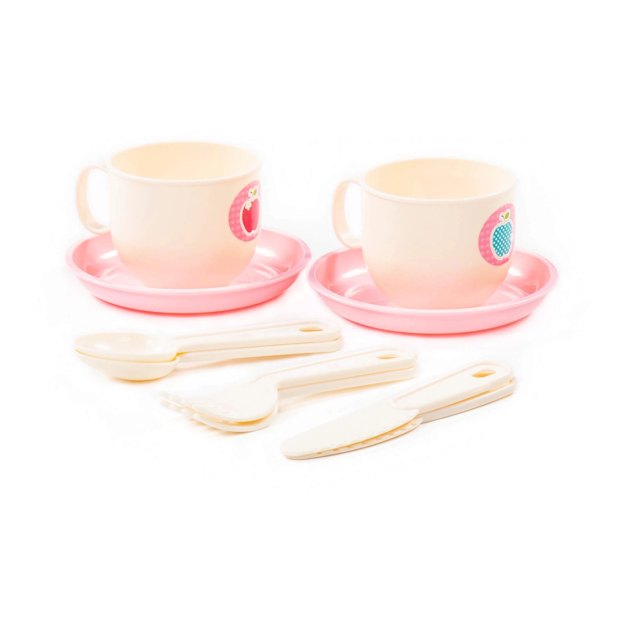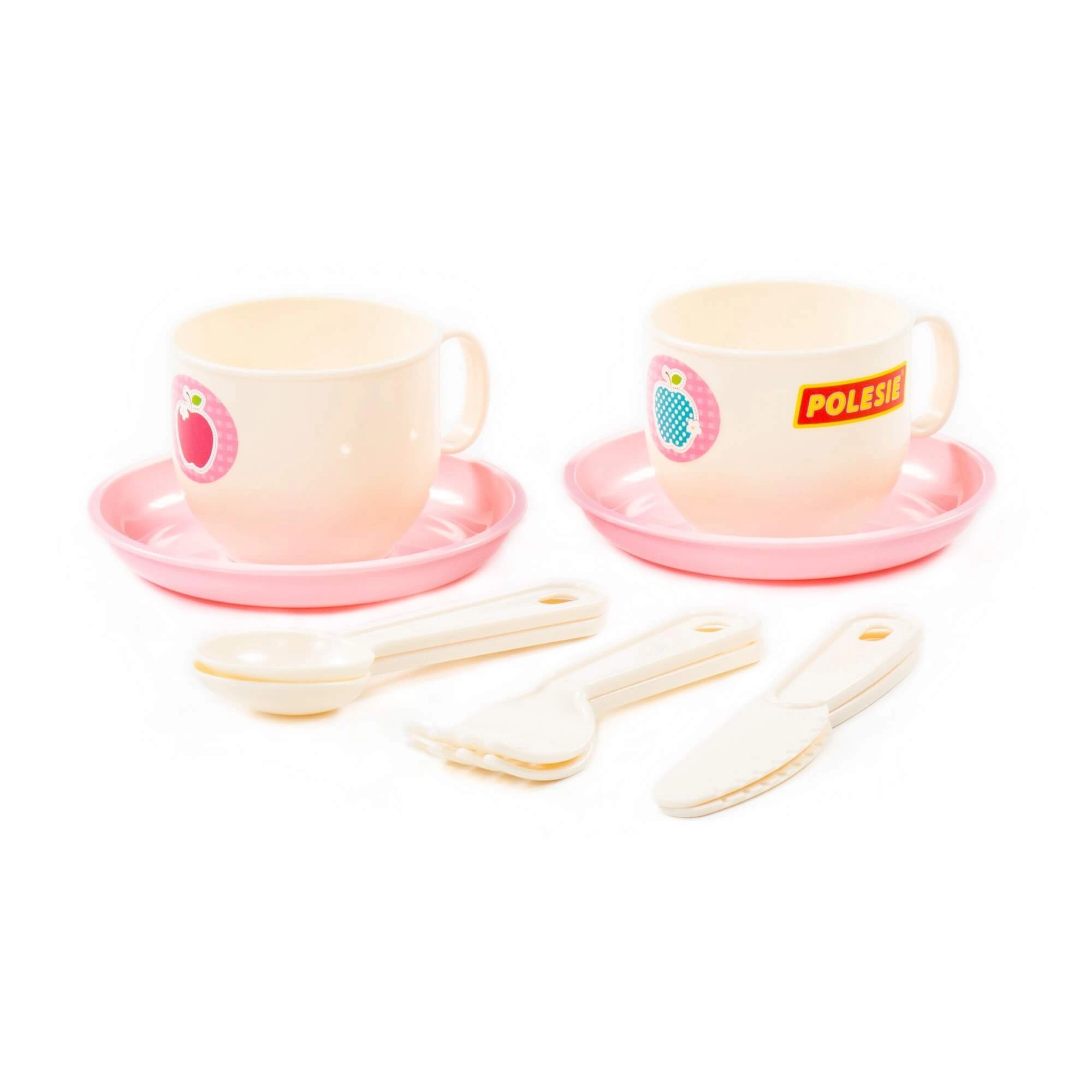Due tazzine con piattini rosa e posate permettono ai bambini di servire come veri padroni di casa.