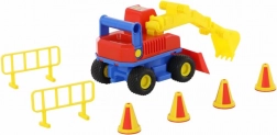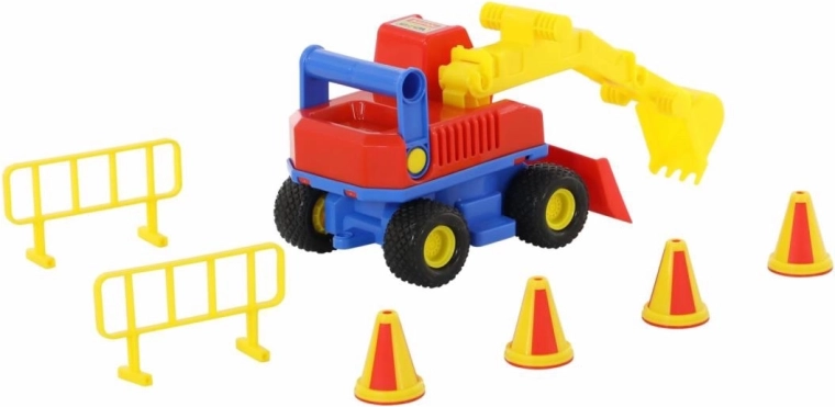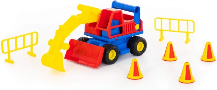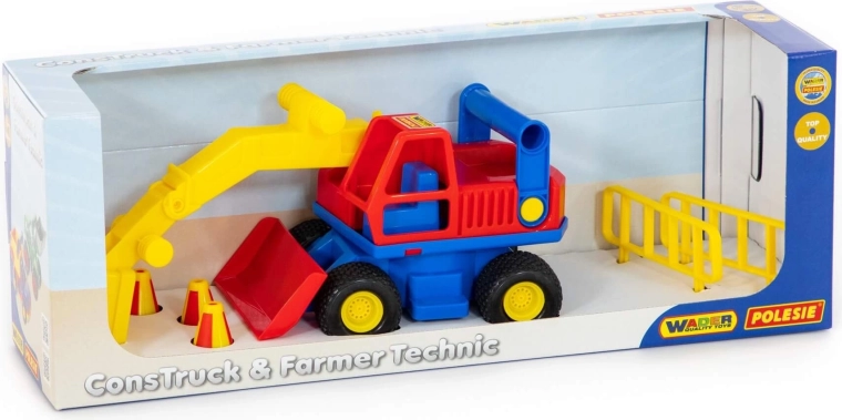 Il Mega escavatore ConsTruck offre ai bambini ore di gioco fantasioso. Grazie alla struttura resistente, ai morbidi pneumatici in gomma e al braccio con benna facile da controllare, i bambini possono raccogliere e spostare con facilità piccoli oggetti. Sono inclusi anche coni e barriere per arricchire scenari di cantiere realistici.