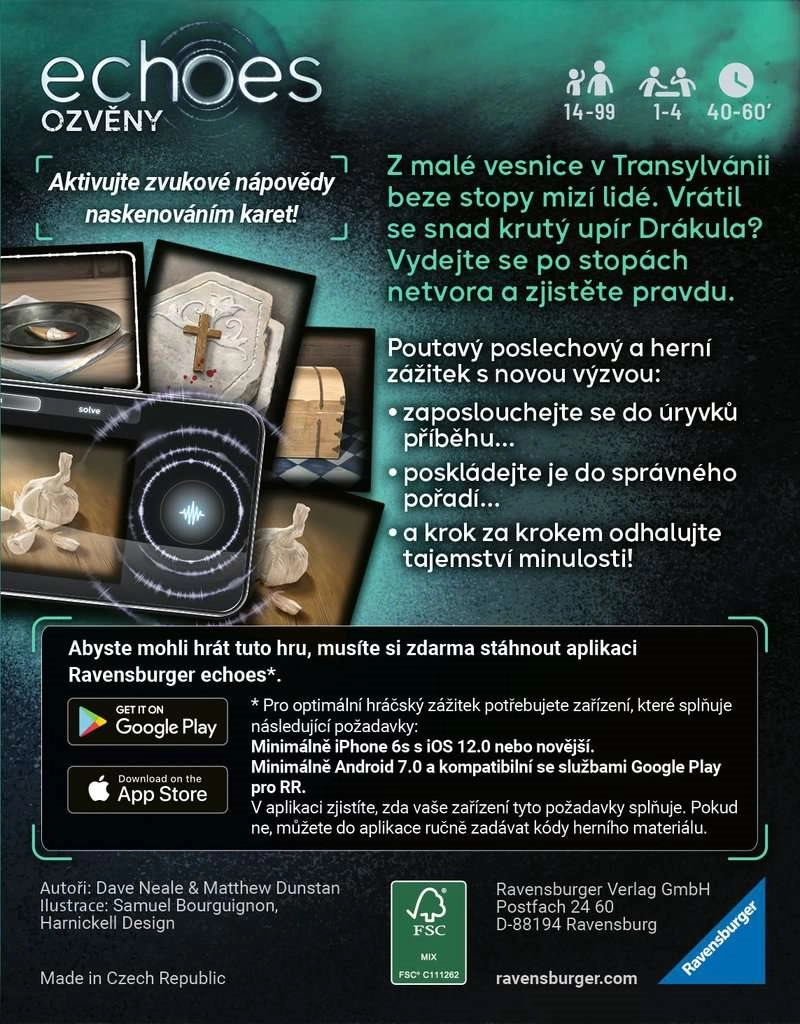 Nell’episodio L’eredità di Dracula ti troverai in un piccolo villaggio della Transilvania, dove circolano voci su un crudele vampiro. Grazie al doppiaggio ceco (narratore Václav Neužil) ti godrai un’atmosfera ricca di tensione, deduzione e suggerimenti intelligenti. Il gioco è ideale per serate in compagnia, sviluppa prontezza, pensiero logico e collaborazione di squadra.