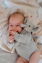 All’estremità dell’impugnatura c’è un morbido massaggiagengive in plastica a forma di fiore che aiuta ad alleviare le gengive sensibili durante la dentizione. I motivi a contrasto su orecchiette e corpo supportano la percezione visiva e lo sviluppo sensoriale. Il giocattolo è certificato nella Repubblica Ceca e soddisfa rigorosi standard di sicurezza per bambini 0m+.