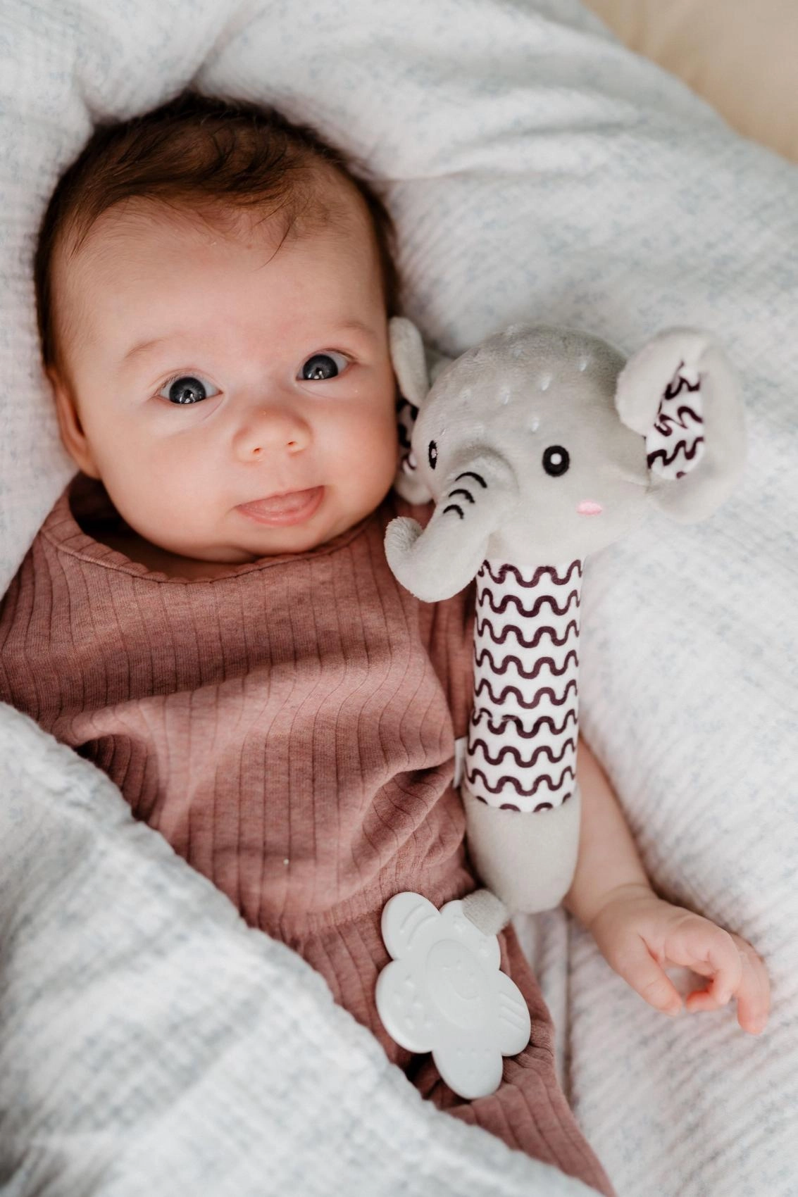 L’elefante in peluche con sonaglio e massaggiagengive è il giocattolo ideale per i neonati. Grazie alla forma ergonomica e allungata, si tiene facilmente anche con manine piccole, il lieve squittio stimola l’udito e attira l’attenzione del bebè. Il materiale morbido e sicuro offre una piacevole sensazione al tatto e un effetto calmante durante le coccole.