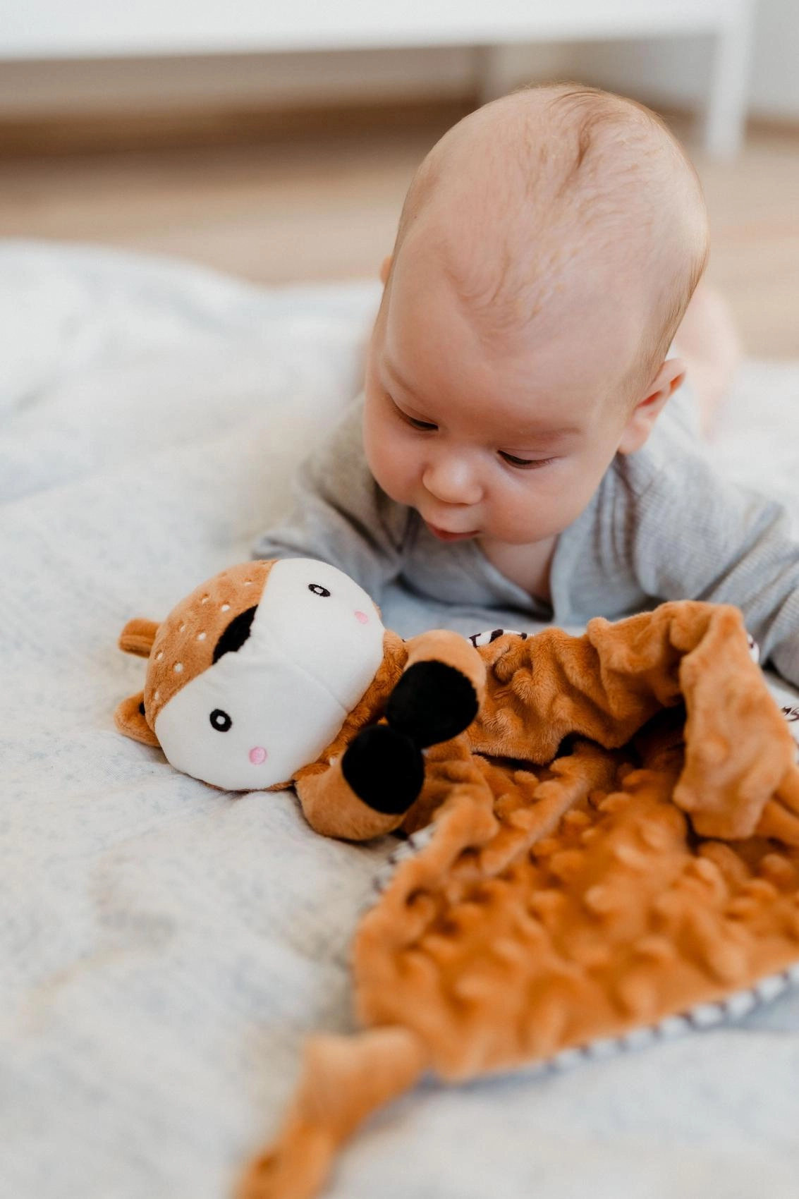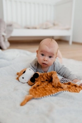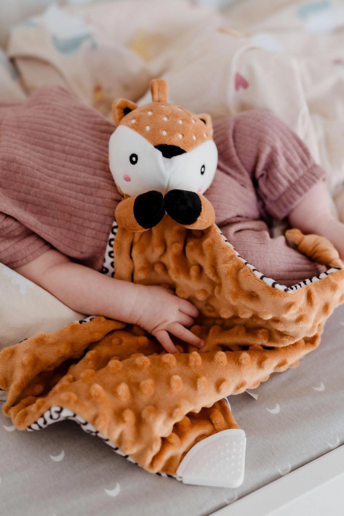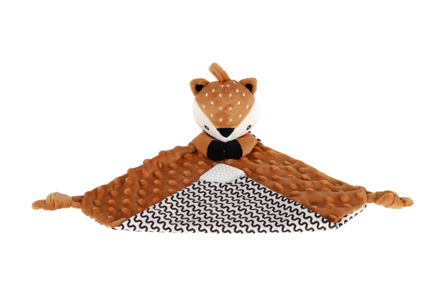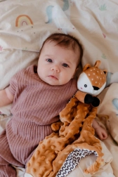 Questo soffice pupazzo nanna con cerbiatto unisce una copertina coccolosa a un tenero amico di peluche. Il tessuto minky testurizzato con pois in rilievo offre una ricca stimolazione tattile e piacevoli coccole. Il massaggiagengive integrato aiuta il bebè durante la dentizione e il delicato sonaglio favorisce la percezione dei suoni e la coordinazione.