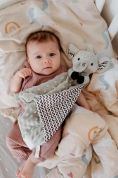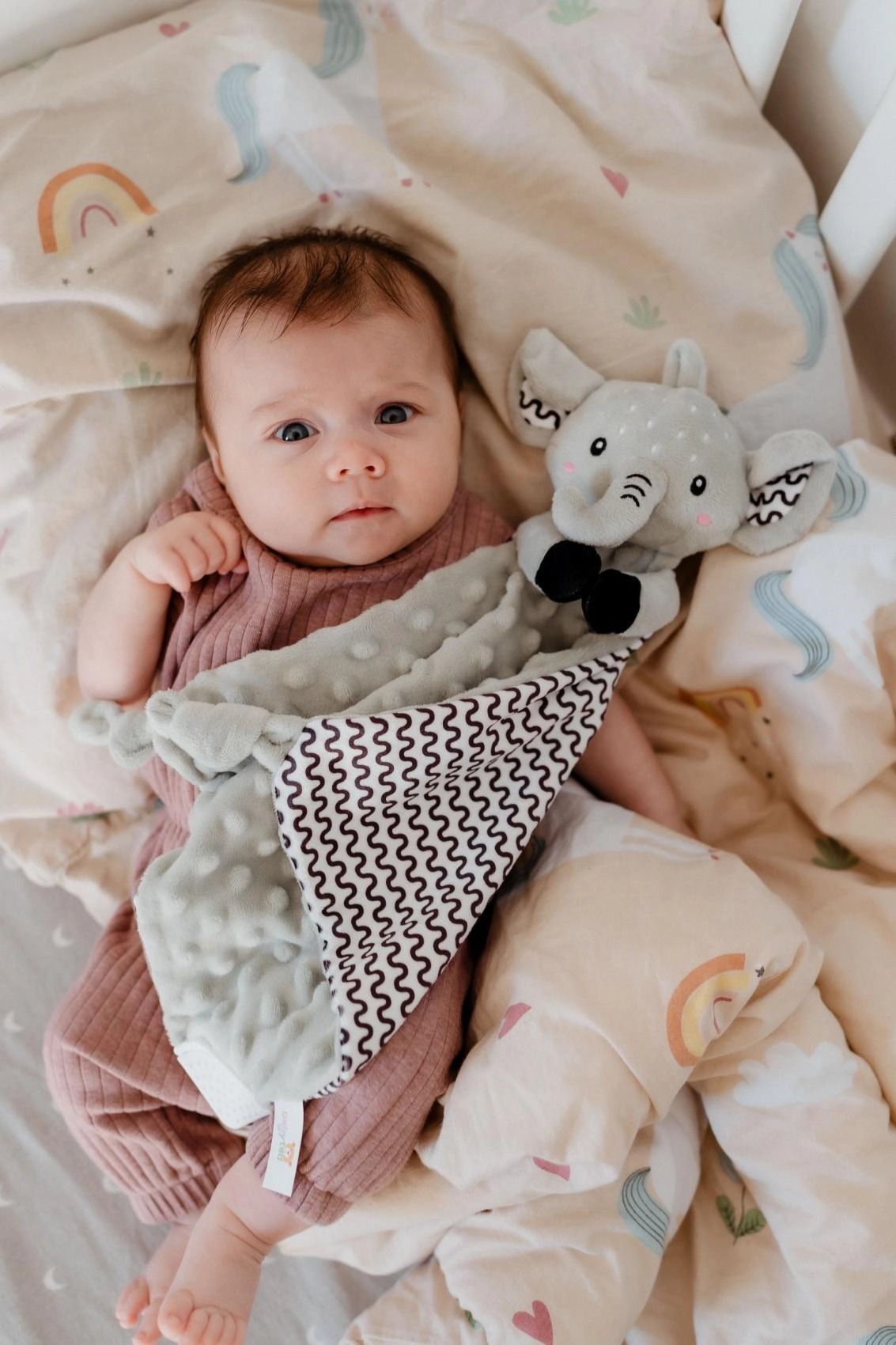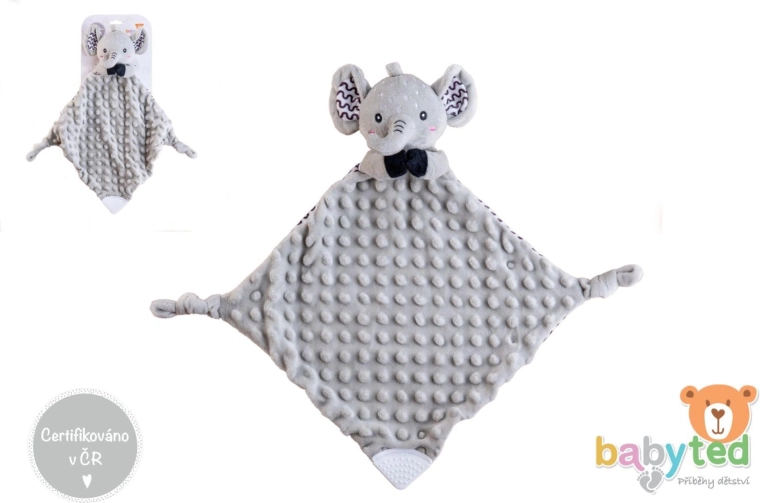 Il morbissimo doudou a forma di elefantino di BABYTED dona al neonato un senso di sicurezza e un sonno tranquillo. Il tessuto minky soffice con pois 3D invita alle coccole, mentre il sonaglino delicato nascosto stimola l’udito e il massaggiagengive in silicone morbido allevia durante la dentizione. Adatto dalla nascita, certificato in Repubblica Ceca.