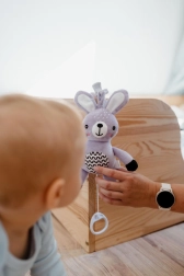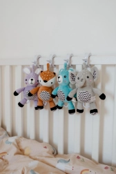 La clip pratica consente di fissare rapidamente il coniglietto a passeggino, lettino, seggiolino auto o palestrina – sempre a portata di mano a casa e in viaggio.