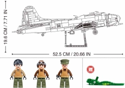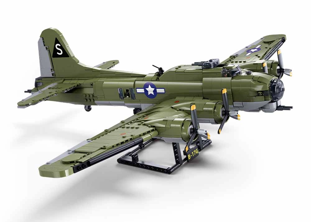 Il modello offre numerosi elementi funzionali: carrello retrattile, eliche girevoli e parti mobili delle ali e della deriva per impostare la configurazione di volo o atterraggio. Inclusi supporto con dicitura B-17G e 3 minifigure dei membri dell’equipaggio con accessori. Il set è compatibile con LEGO, Cobi e Mega Bloks, così potrai espandere facilmente il tuo modello con ulteriori elementi.