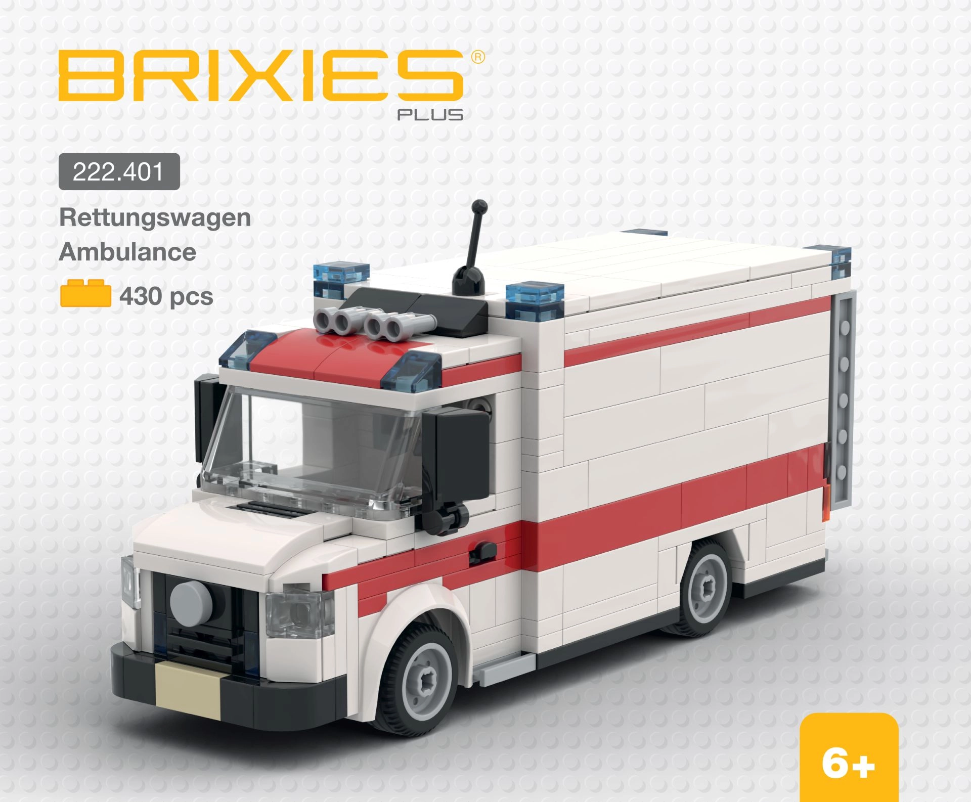 Divertiti con una costruzione creativa grazie al modello dettagliato del veicolo di emergenza. I mattoncini più grandi della linea BRIXIES Plus facilitano la presa e sono compatibili con i comuni set di costruzioni di tipo simile. L’alta qualità e i dettagli realistici rendono l’ambulanza un ottimo pezzo per ogni collezione.