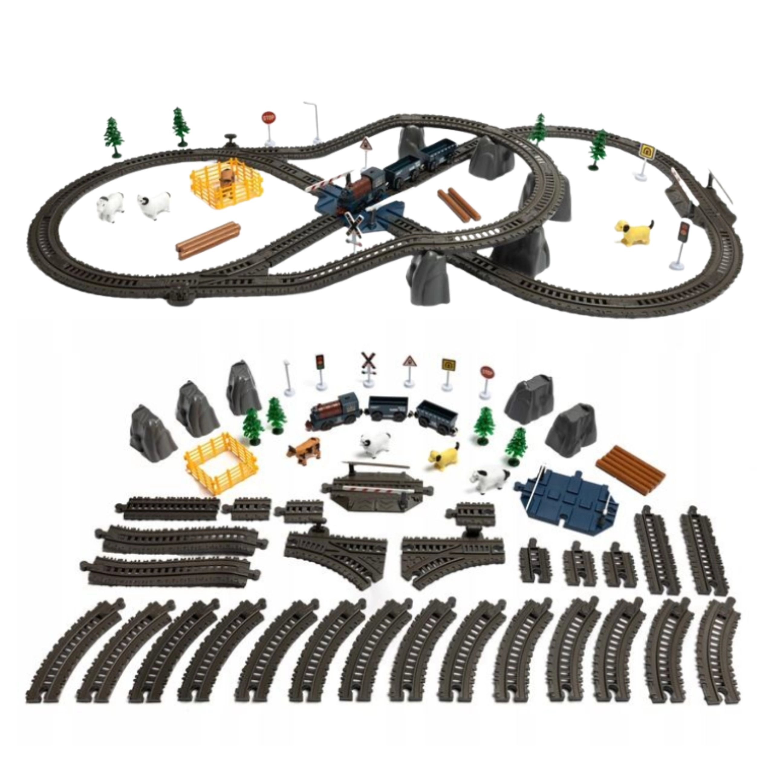 Costruisci semplici circuiti o percorsi complessi con giunti a scatto, scambi e anelli. I bambini possono caricare le figure degli animali sui vagoni, gestire il traffico al passaggio a livello e sviluppare così coordinazione e pensiero logico. La struttura in plastica sicura è adatta ai più piccoli.