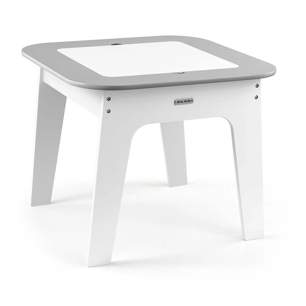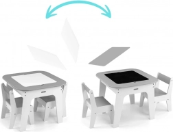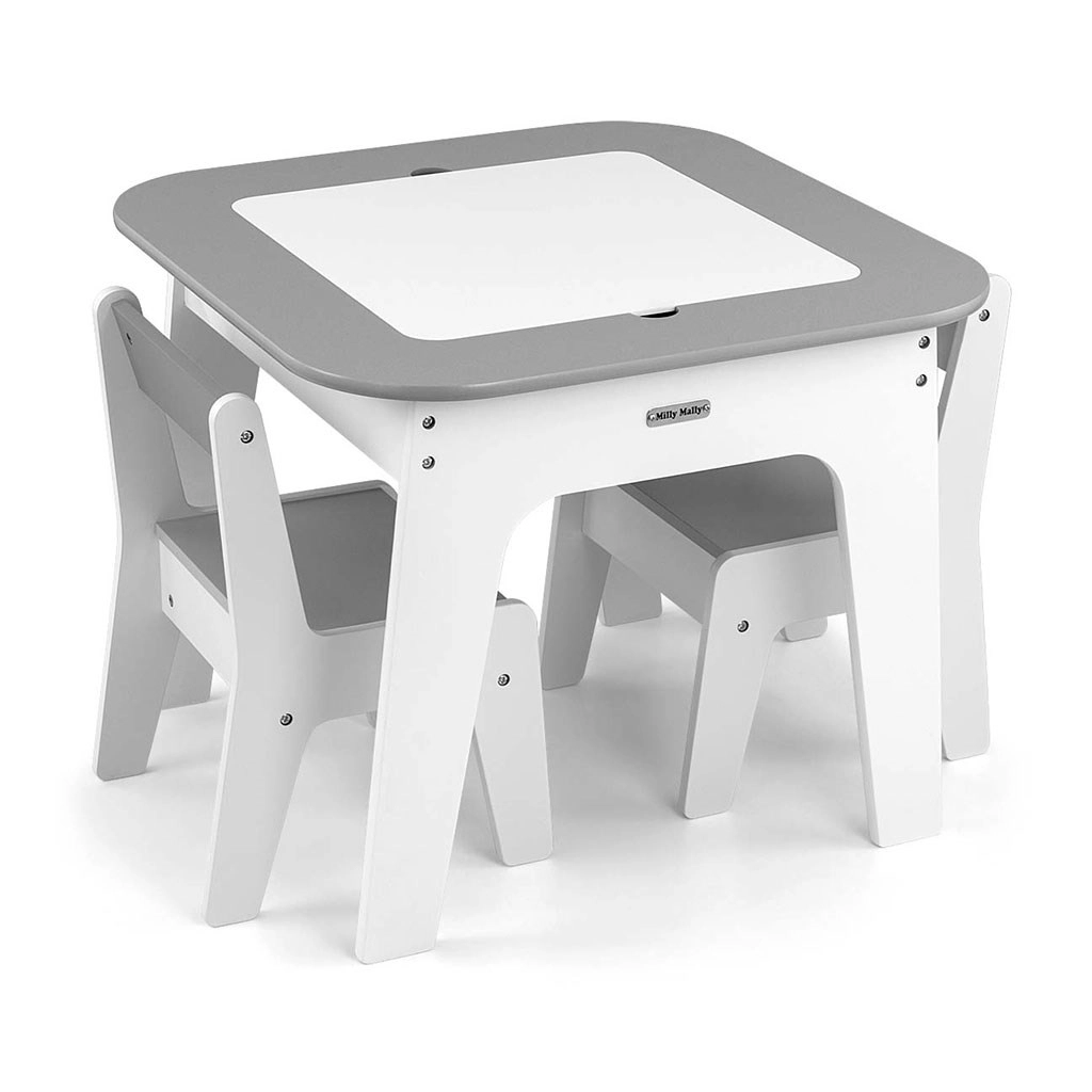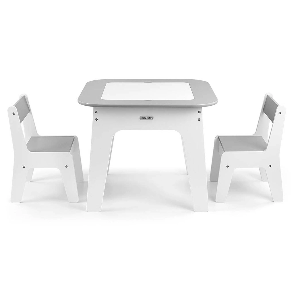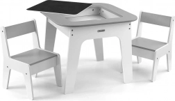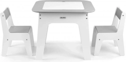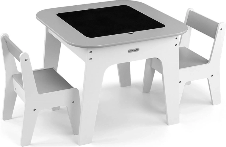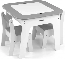 Set di mobili per bambini multifunzionale MILLY MALLY Olaf Grey – tavolino e due sedie – offre uno spazio confortevole, sicuro e pratico per giocare e studiare. Il tavolo ha un piano bifacciale con possibilità di disegnare con il gesso e sotto di esso un ampio box contenitore per giocattoli e accessori. Angoli arrotondati, struttura stabile e facile manutenzione garantiscono comfort quotidiano.