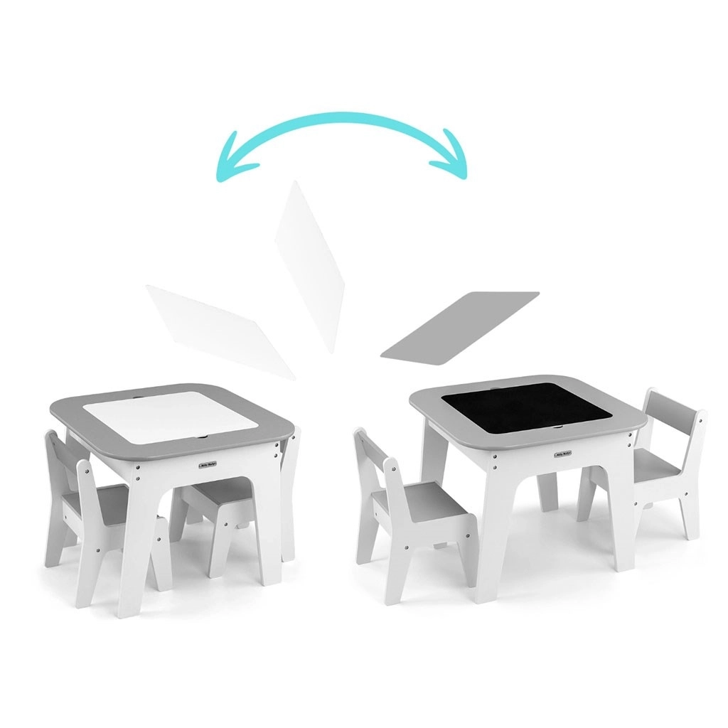 Il set Olaf Grey unisce look moderno e funzioni intelligenti. Il piano bifacciale rimovibile offre una superficie bianca liscia e un lato a lavagna per disegnare con il gesso. Sotto il piano si trova un ampio spazio contenitore che aiuta a mantenere in ordine l’angolo dei bambini. La struttura leggera ma stabile consente ai piccoli di spostare facilmente le sedie.