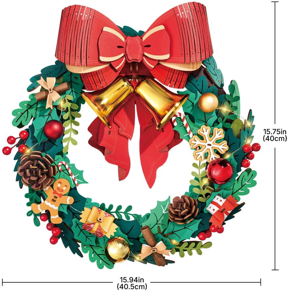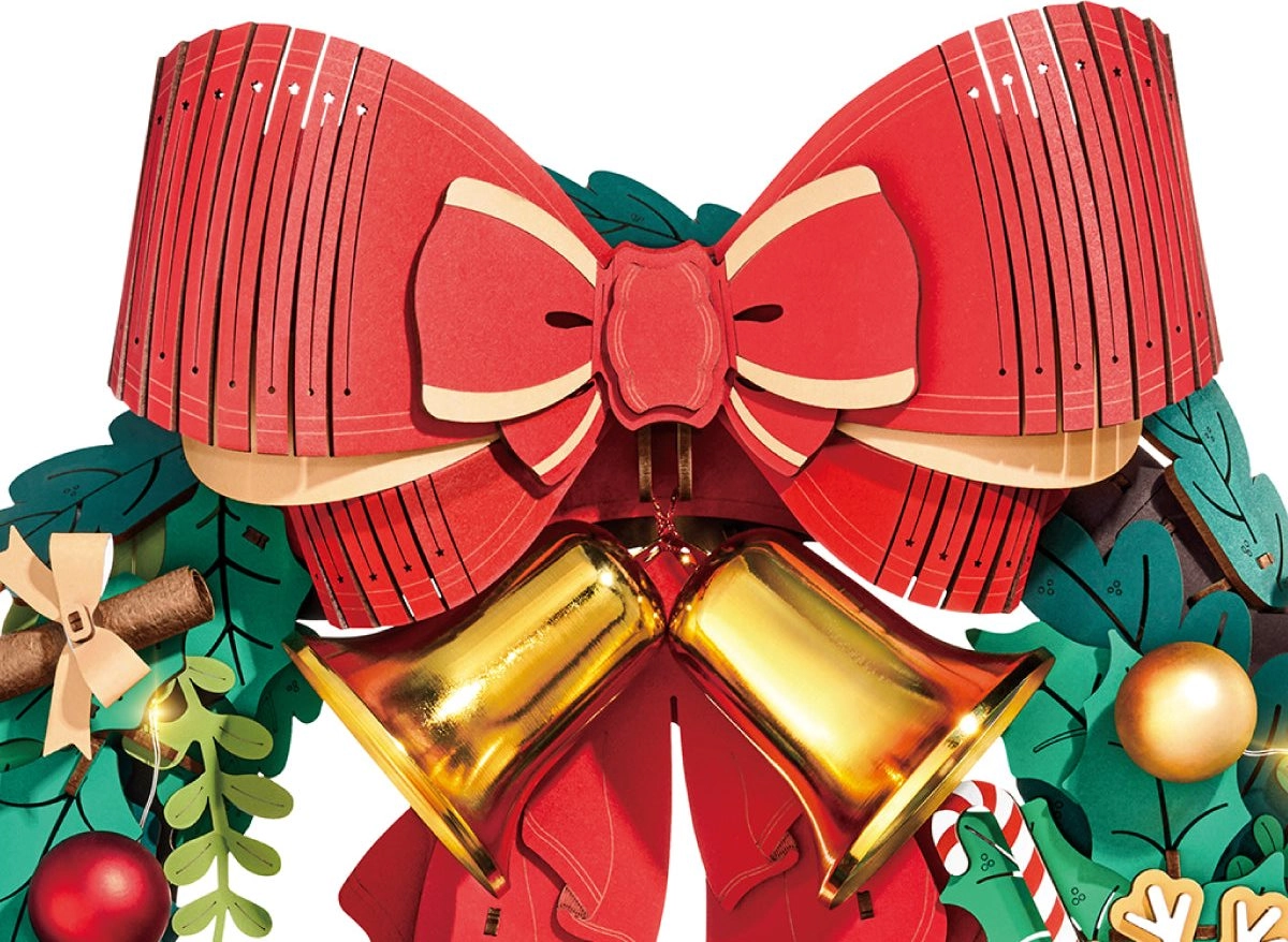 Questa elegante ghirlanda natalizia combina motivi tradizionali e divertimento DIY moderno. I rami verdi sono arricchiti da decorazioni come agrifoglio, bacche, pigne, fiocchi di neve, omino di pan di zenzero, regali e l’iconico grande fiocco rosso con campanellini dorati. I LED integrati esaltano l’atmosfera festiva e trasformano il modello finito in una decorazione unica per porta o parete.
