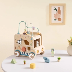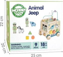 Scopri un mondo di gioco con il cubo attivo in legno a forma di auto safari del marchio WOOPIE GREEN. Questo giocattolo multifunzionale combina labirinto motorico, inserimento forme, ingranaggi girevoli e blocchi illustrati per sostenere la motricità fine, la coordinazione e il gioco creativo dei bambini a partire da 18 mesi.