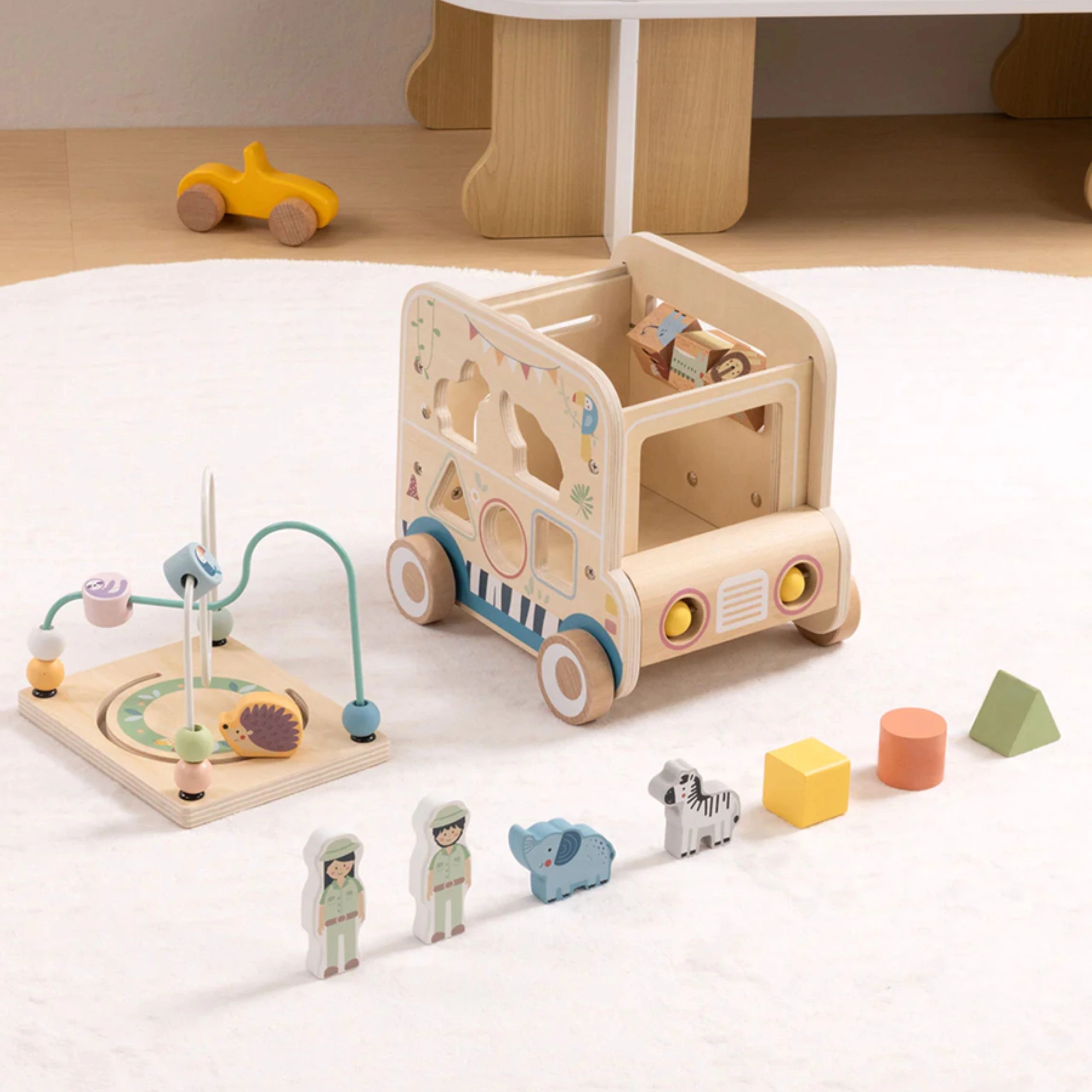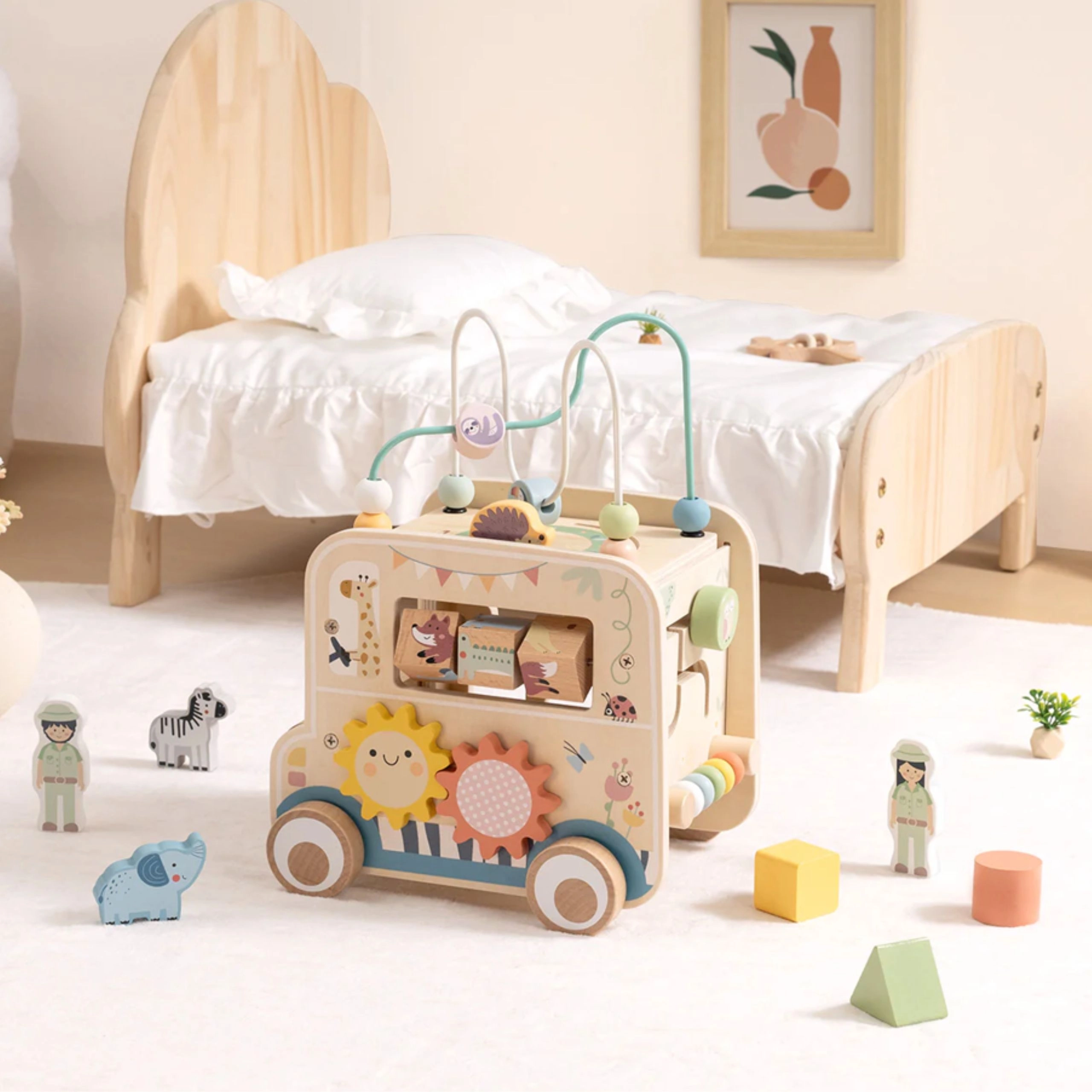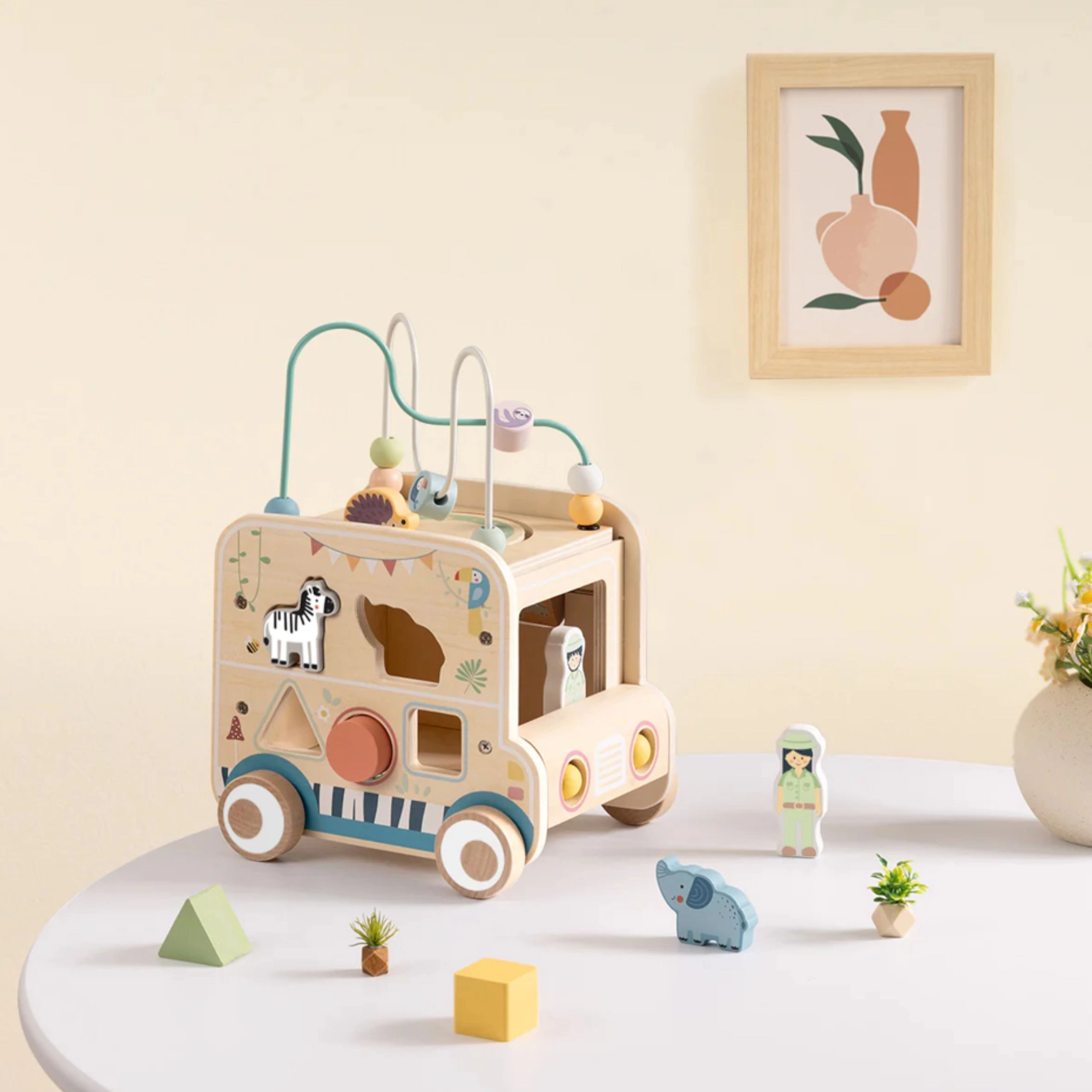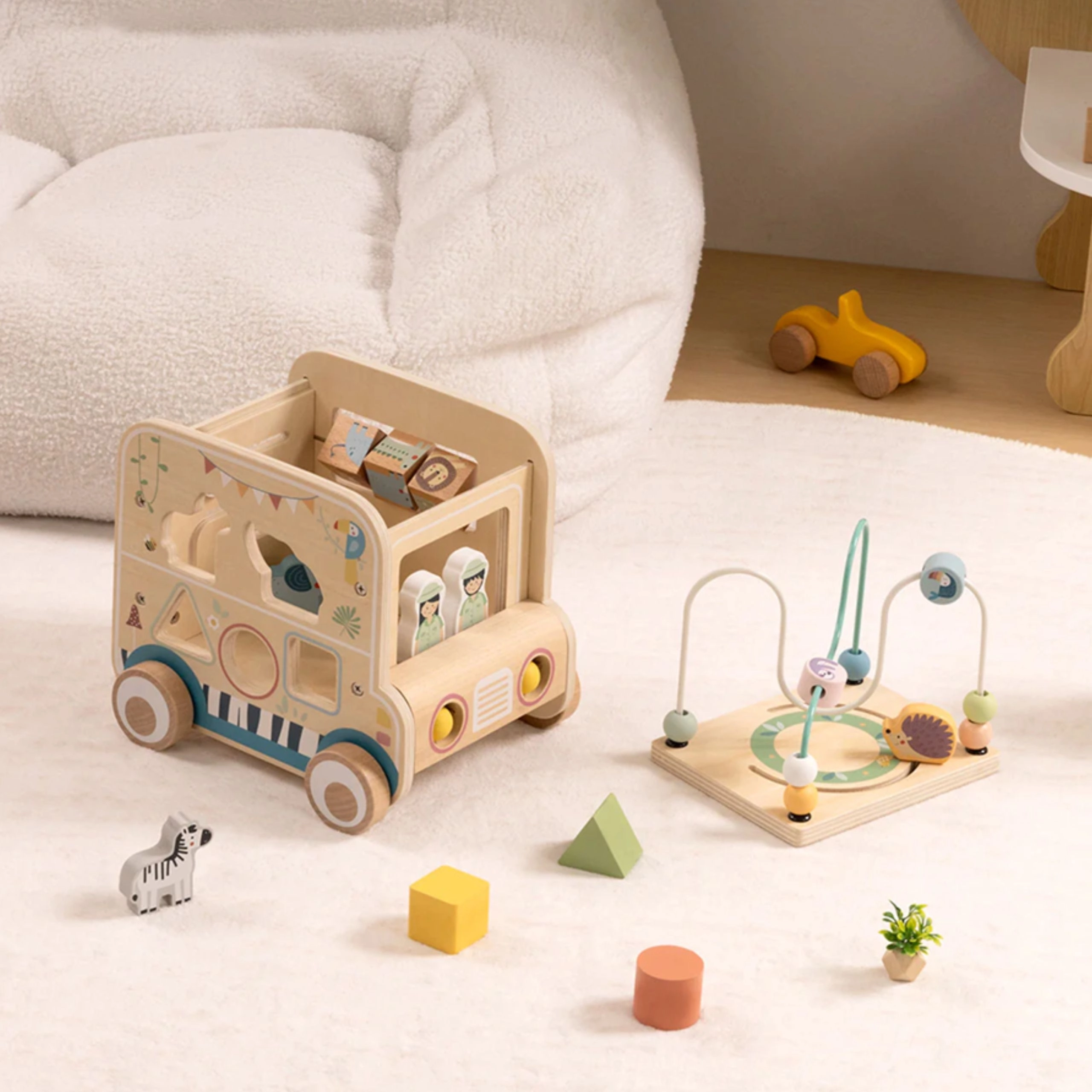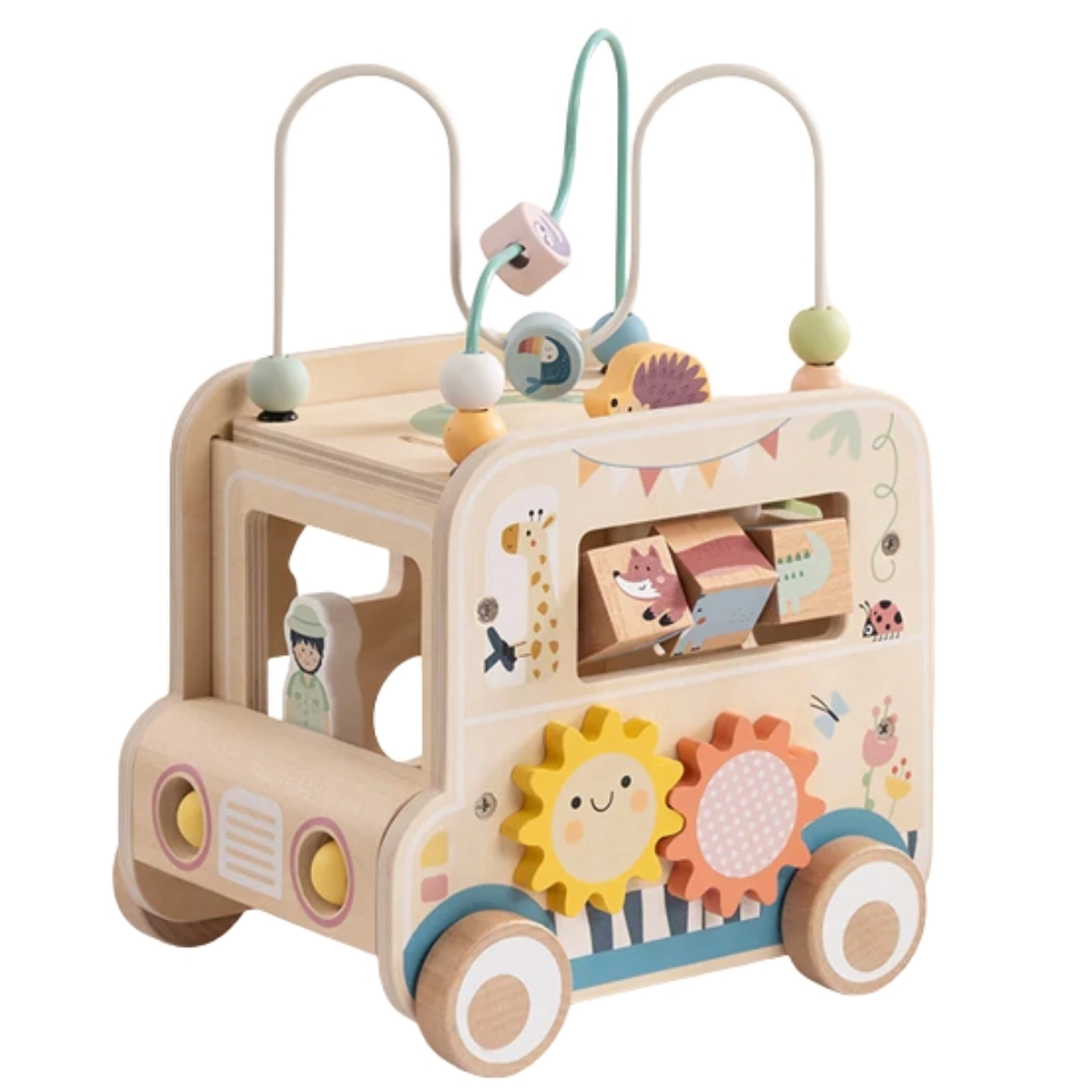 Il cubo/auto safari attivo in legno offre ai bambini infinite possibilità di scoperta. Dall’archetto motorico removibile con perline, al labirinto e agli ingranaggi, fino ai blocchi girevoli con animali: ogni lato propone una nuova sfida. Il design in colori delicati e le finiture lisce favoriscono un gioco sicuro e lo sviluppo delle abilità.