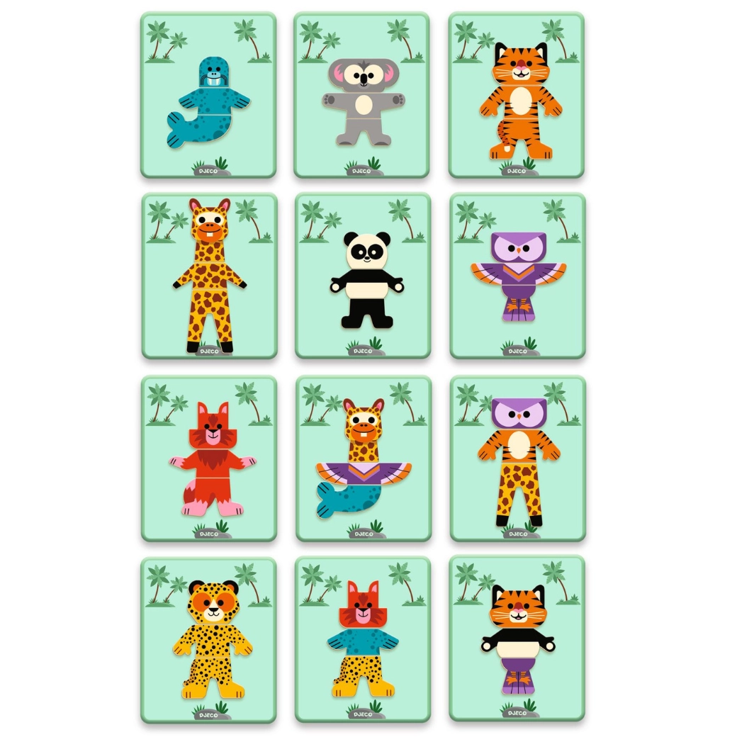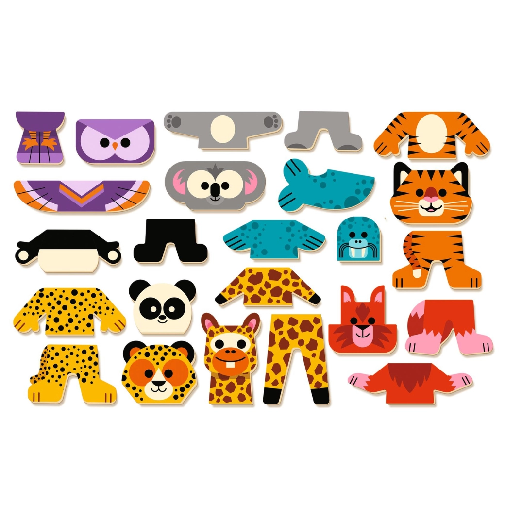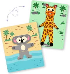 Mescola teste, corpi e zampette per creare personaggi divertenti. I bambini sviluppano immaginazione e ragionamento logico durante il gioco.