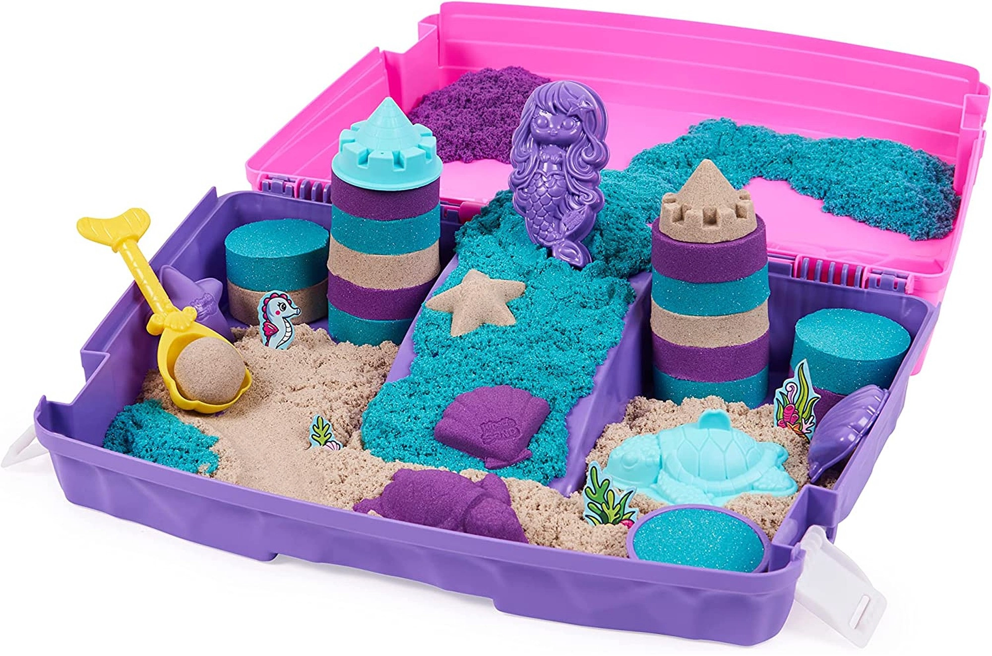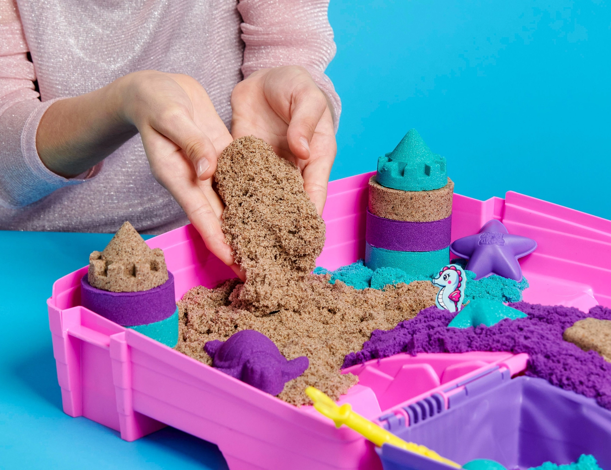 La texture unica di Kinetic Sand fa sì che i granelli si attraggano, impedendo alla massa di spargersi per la stanza e mantenendo spigoli puliti ai modelli. I bambini possono creare facilmente castelli, torri, conchiglie, stelle marine, piccole tartarughe e sirene. Il set è adatto dai 3 anni.