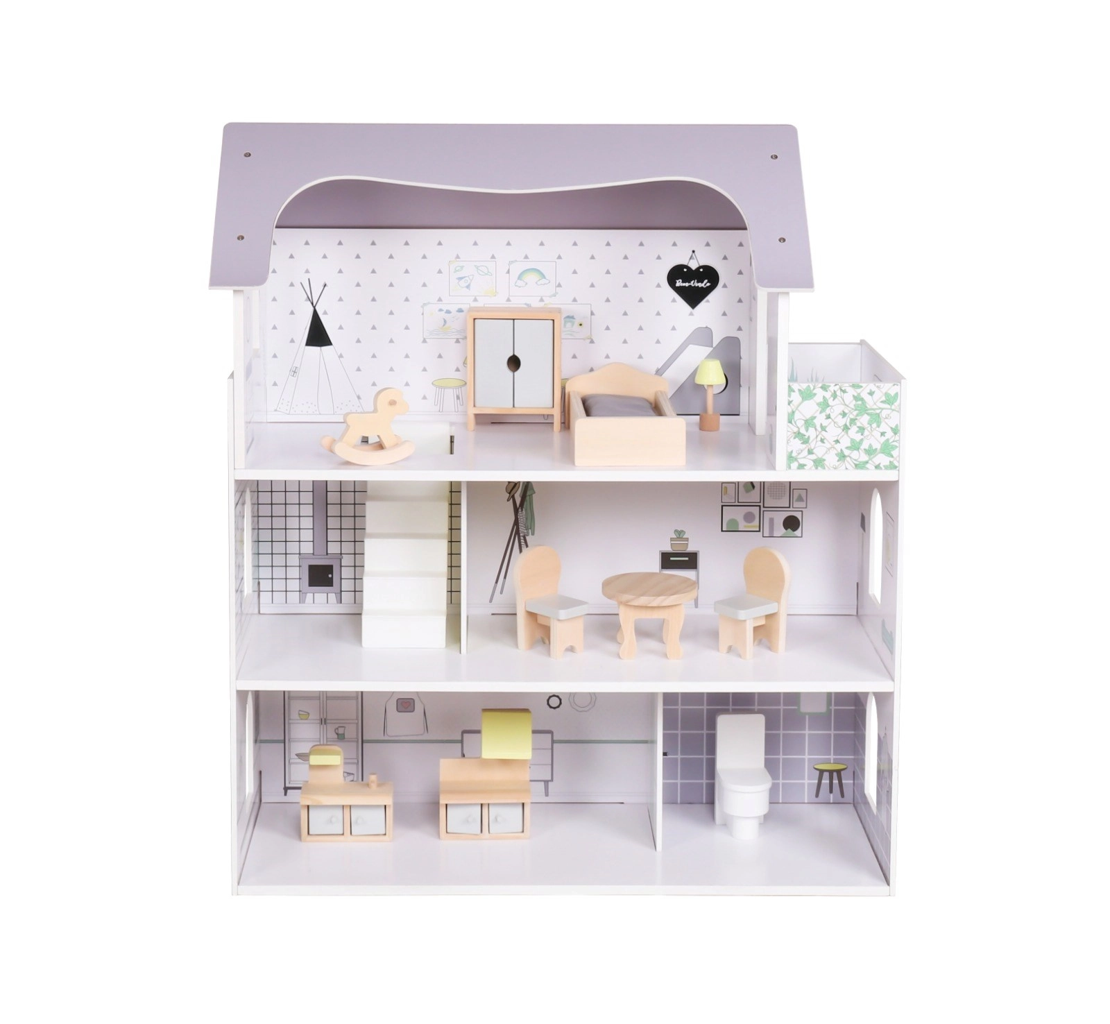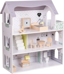 La confezione include 10 pezzi di mobili (letto, tavolo, sedie, elementi della cucina, armadietto, toilette, ecc.), da disporre liberamente. La struttura di qualità in MDF e legno massello è stabile, resistente e sicura per l'uso quotidiano. La delicata palette pastello si adatta a qualsiasi interno.