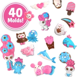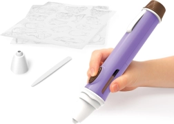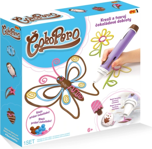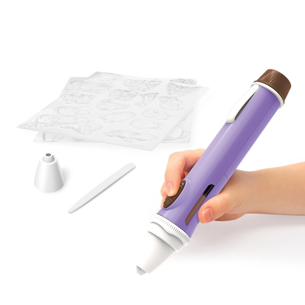 Il set include due stampi trasparenti con un totale di 50 motivi – da animaletti e cuoricini a fiori e decorazioni. I bambini possono così creare facilmente splendide decorazioni di cioccolato e figurine, per la gioia di famiglia e amici. Basta riempire la penna con cioccolato fuso seguendo le istruzioni, premere il pulsante e iniziare a creare.