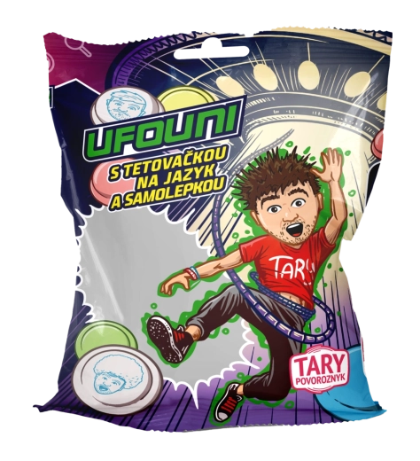Tary UFO è un lecca-lecca giocoso che conquista sia per il gusto sia per l’effetto sorpresa. Dopo averlo leccato, sulla lingua appare un tatuaggio temporaneo che garantisce un tocco di divertimento. Nella confezione trovi anche un adesivo 40×40 mm – ideale per quaderni, smartphone o skateboard.
