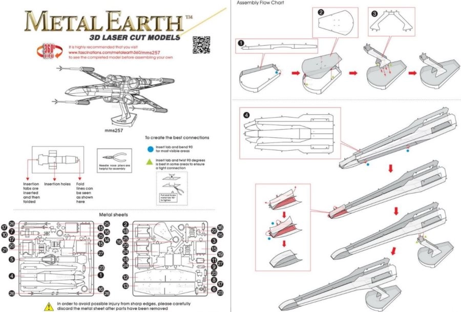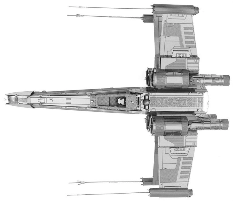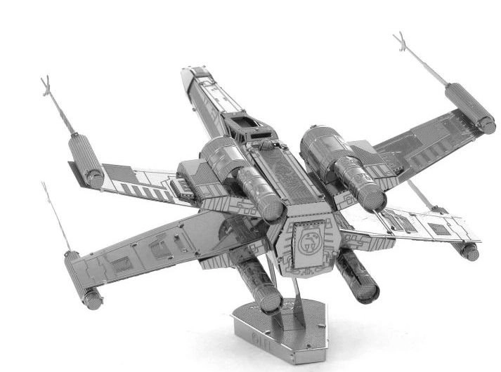 Questo modello 3D in metallo Star Wars X‑Wing è composto da due fogli di acciaio (11 × 11 cm) con parti incise al laser con precisione. L’assemblaggio richiede pazienza e manualità, ma ricompensa con una miniatura realistica dell’iconico caccia con pannelli finemente delineati, motori e cannoni laser.