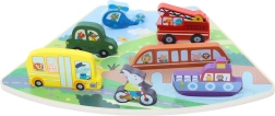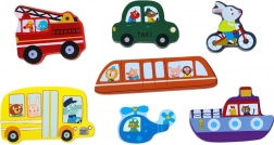 Divertente puzzle a incastri in legno con tema dei mezzi di trasporto che sviluppa la motricità fine e il pensiero logico dei bambini dai 18 mesi. Contiene 7 pezzi sagomati che si incastrano perfettamente nella base e possono essere utilizzati anche singolarmente durante il gioco. Il puzzle è collegabile ad altri temi e consente di creare un colorato cerchio di scene con trasporti, animali o mondo sottomarino.