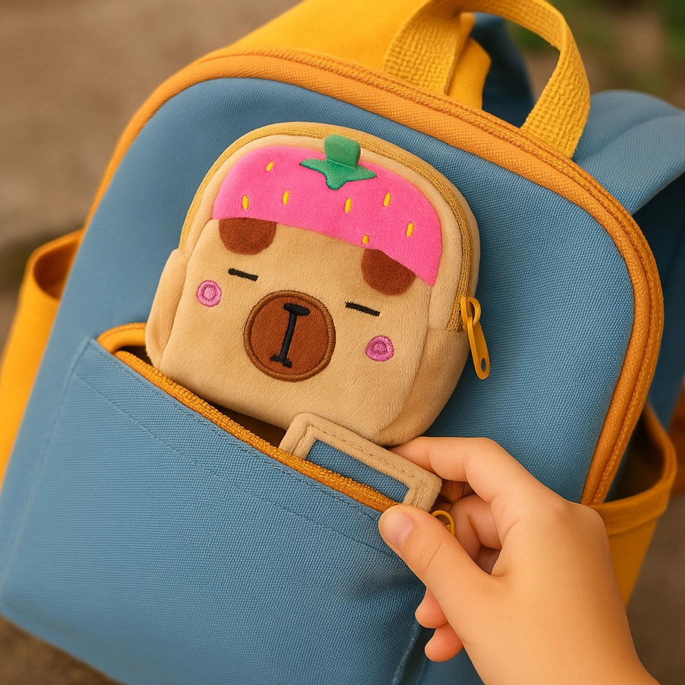 Il materiale in peluche e il motivo della capibara con fragolina rosa aggiungono un tocco di dolcezza kawaii a ogni giornata – ideale per bambini e spiriti giocosi.