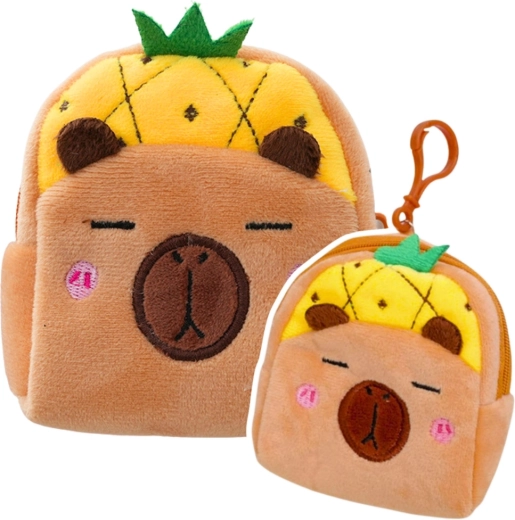Adorabile portamonete in peluche a forma di capibara con motivo di ananas giallo, ideale per bambini e per chi ama gli accessori morbidi. È leggero, piacevole al tatto e grazie alle dimensioni compatte 9,5 × 8 cm entra in borsa, zaino o astuccio. La chiusura a zip conserva al sicuro i piccoli oggetti e il clip in plastica permette di agganciarlo facilmente a chiavi o borsa.