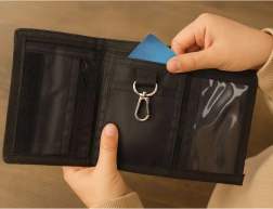 Grazie alla chiusura a strappo rapida i bambini hanno tutto ben chiuso e al tempo stesso subito a portata di mano. All’interno trovano una taschina con zip per le monete, uno scomparto per le banconote, una finestra trasparente per tessera o foto e un gancio/moschettone in metallo per agganciare una chiave o un portachiavi.