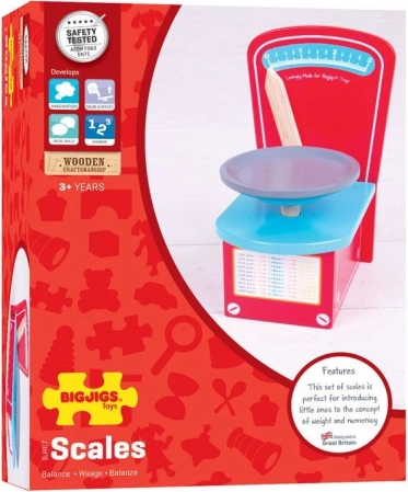 Questa bilancia funzionale interamente in legno di Bigjigs Toys è l’accessorio ideale per la cucina dei bambini. Durante il gioco del cucinare, i bambini allenano il calcolo, la stima del peso e le abilità sociali nel gioco condiviso.
