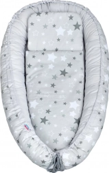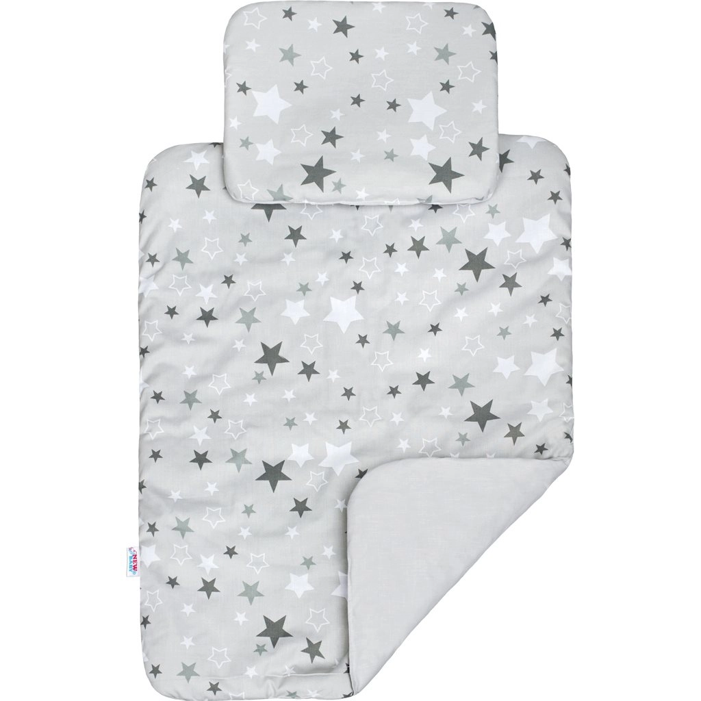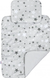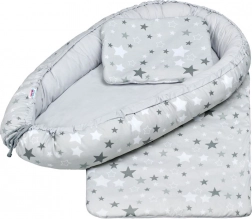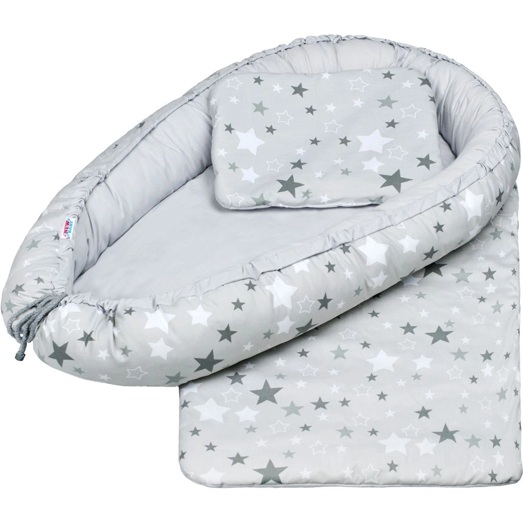 - Set pratico – nido, piumino e cuscinetto nel design uniforme con stelline bianco‑grigie.