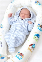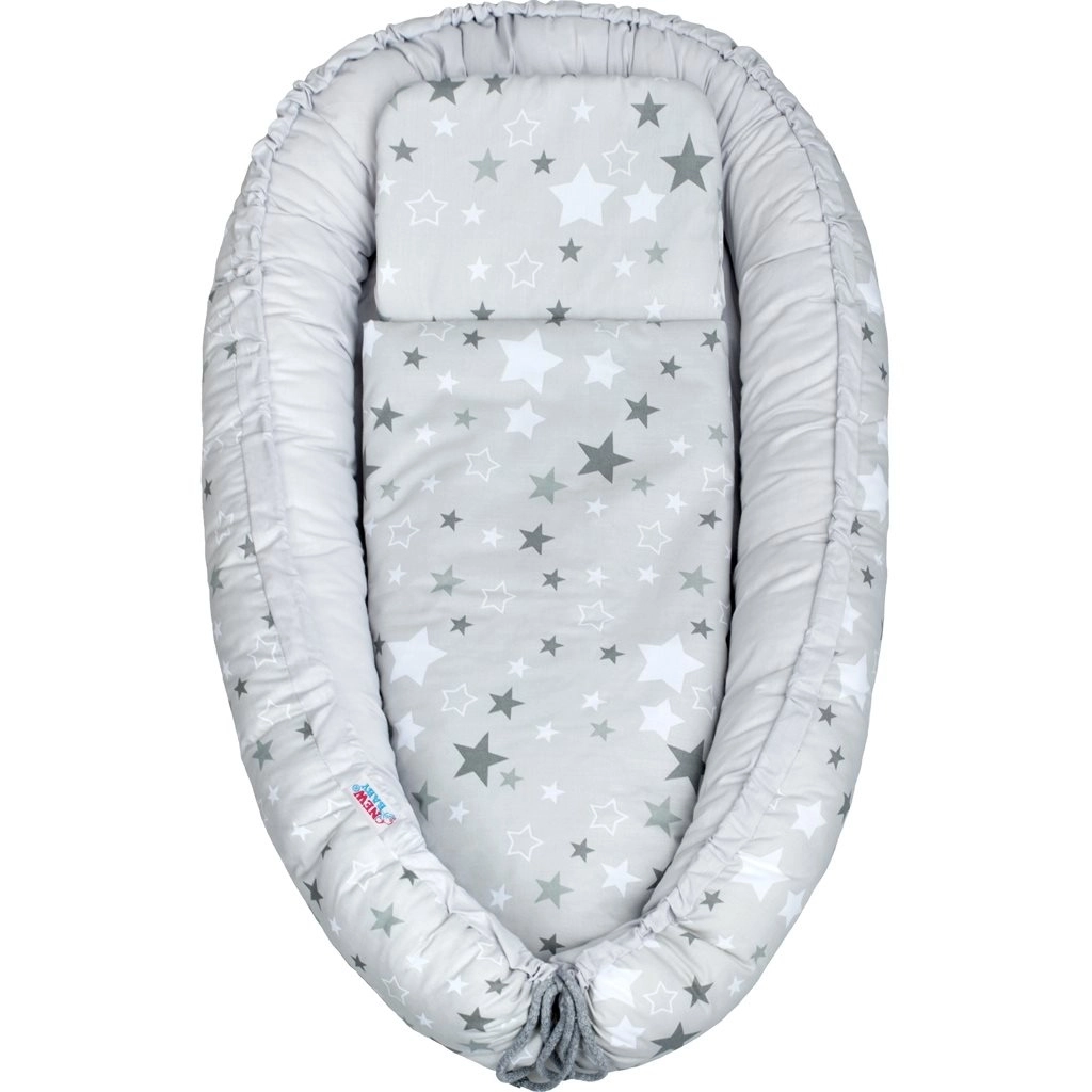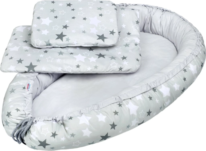 Offri al tuo bebè un luogo sicuro e accogliente per dormire con il nido lussuoso NEW BABY nel design bianco‑grigio con stelline. Il nido è adatto dalla nascita fino a circa 3 mesi, realizzato in 100% cotone con imbottitura anallergica per il massimo comfort e sicurezza. Include una morbida piumino e un cuscinetto, utilizzabili anche nel passeggino o nella culla.