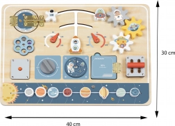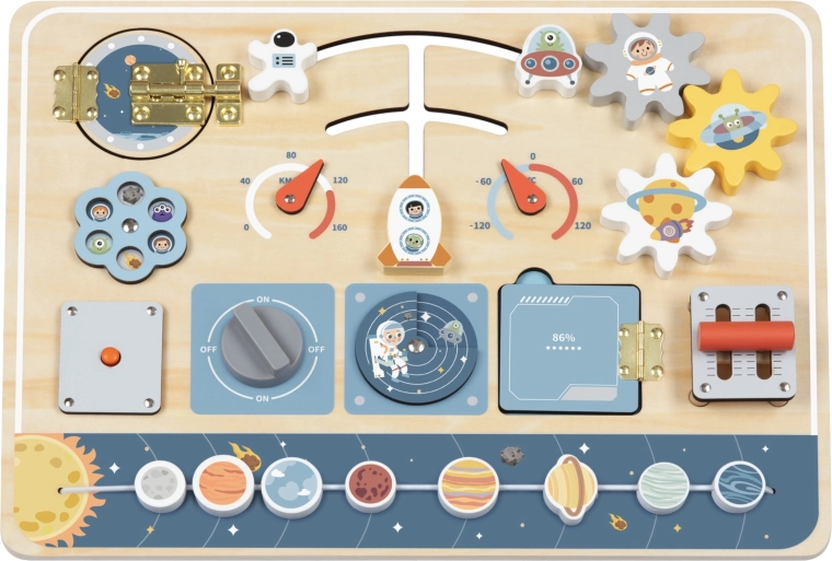 Questa tavola educativa in legno trasporta i bambini nel mondo delle scoperte cosmiche. Ogni elemento – dagli interruttori e leve fino al radar girevole – stimola la curiosità e la concentrazione. I bambini giocano a pilotare un'astronave, osservano gli “strumenti” e imparano attraverso il tatto, il movimento e la ripetizione.