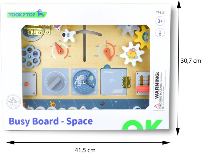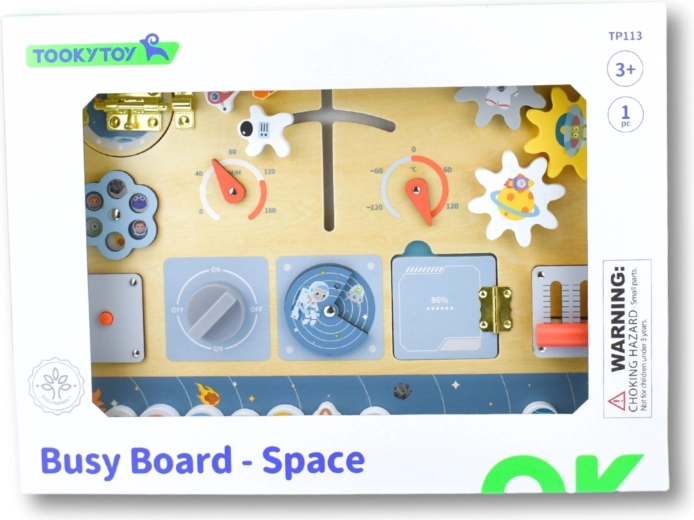 Parti per una missione nello spazio con la tavola interattiva in legno Tooky Toy, che unisce i principi Montessori al gioco creativo. Motivi colorati di pianeti, razzi e astronauti e numerosi elementi manipolativi sviluppano la motricità fine, la logica e l'immaginazione dei bambini dai 3 anni.
