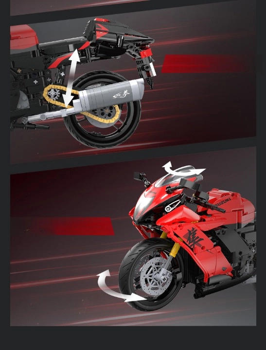 Questa replica con licenza della leggendaria SUZUKI Hayabusa deliziere0 gli appassionati di moto e gli amanti dei set tecnici. Dettagli accurati come specchietti, faro, carena, parafanghi e trasmissione a catena sono completati da sospensioni anteriori e posteriori funzionanti e da una forcella anteriore sterzante. Una volta completato, il modello risalta perfettamente sullo stand con targhetta incluso.