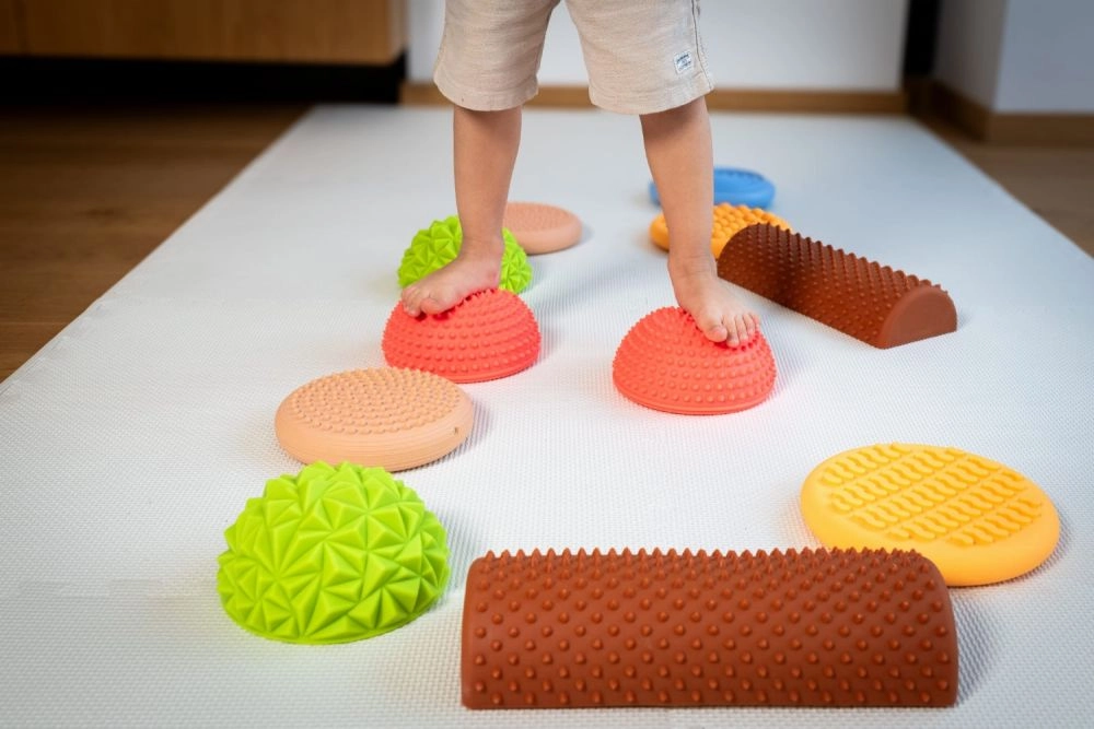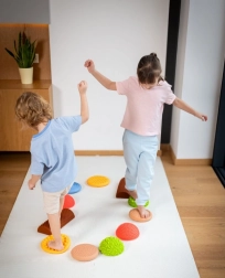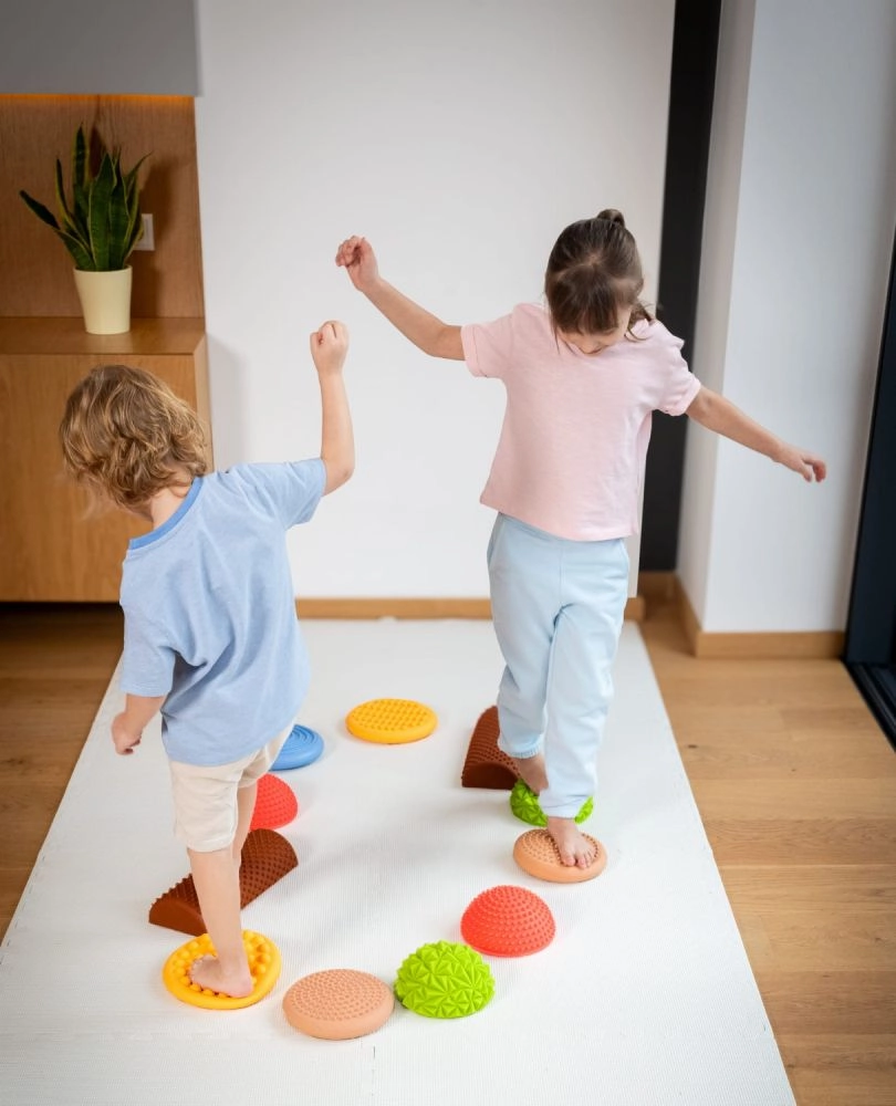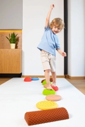 Il set include una combinazione di cupole, dischi e mezzi rulli, che possono essere disposti liberamente in linee rette o in circuiti di gioco. Grazie alla struttura solida ma elastica e alla finitura antiscivolo, gli elementi sono sicuri su pavimenti piani e tappetini da allenamento. Adatto per esercizi a casa, asili, scuole, fisioterapia e integrazione sensoriale.