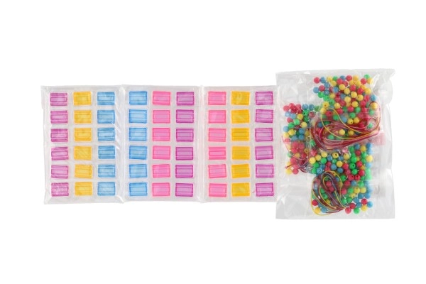 Perline variopinte, tasselli quadrati, elastici e adesivi: basta aprire e iniziare a creare senza ulteriori acquisti.