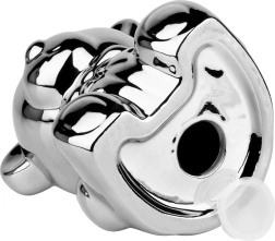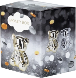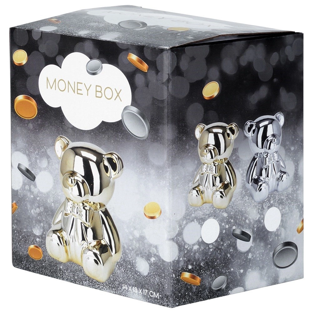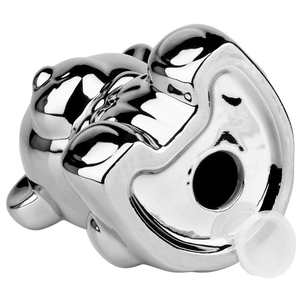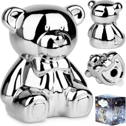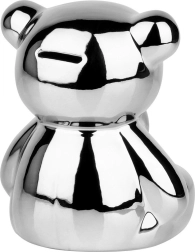 Questo salvadanaio in ceramica argentata a forma di orsetto unisce design glamour moderno e praticità. La finitura a specchio dona agli interni un tocco di lusso e al contempo incentiva al risparmio regolare di monete e banconote.