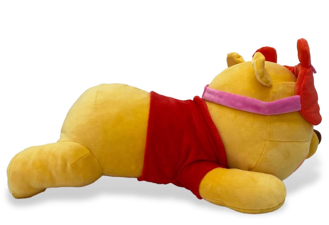 Dolcissimo orsacchiotto di peluche WINNIE THE POOH in posizione sdraiata, ideale per coccole, relax e addormentarsi. Realizzato in materiale straordinariamente morbido, dotato di comoda mascherina per gli occhi e di un piacevole effetto appesantito nelle zampette per calma e senso di sicurezza. Lunghezza circa 40 cm, un compagno perfetto per bambini di tutte le età.