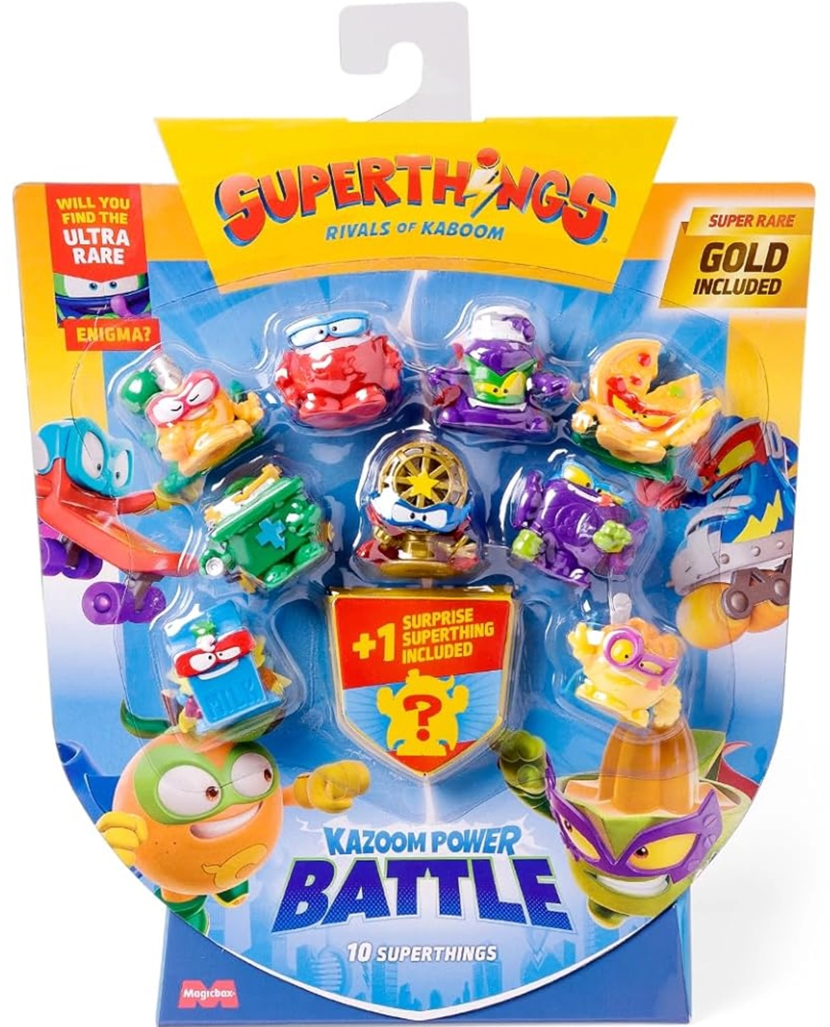 Scopri il mondo dei SuperThings con questo set che include 9 figurine e 1 sorpresa della serie Kazoom Power Battle. Ogni mini personaggio rappresenta un oggetto di uso quotidiano trasformato in supereroe o cattivo. Ideale per bambini che amano collezionare, giocare e scoprire rarità.