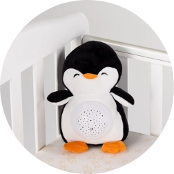 Questo soffice pinguino con proiettore integrato e scatola musicale crea sulle pareti della cameretta un cielo stellato e, con melodie delicate, aiuta i bambini ad addormentarsi serenamente. Con un solo tocco, il proiettore inizia a ruotare e realizza una suggestiva proiezione colorata che calma l’atmosfera prima della nanna.