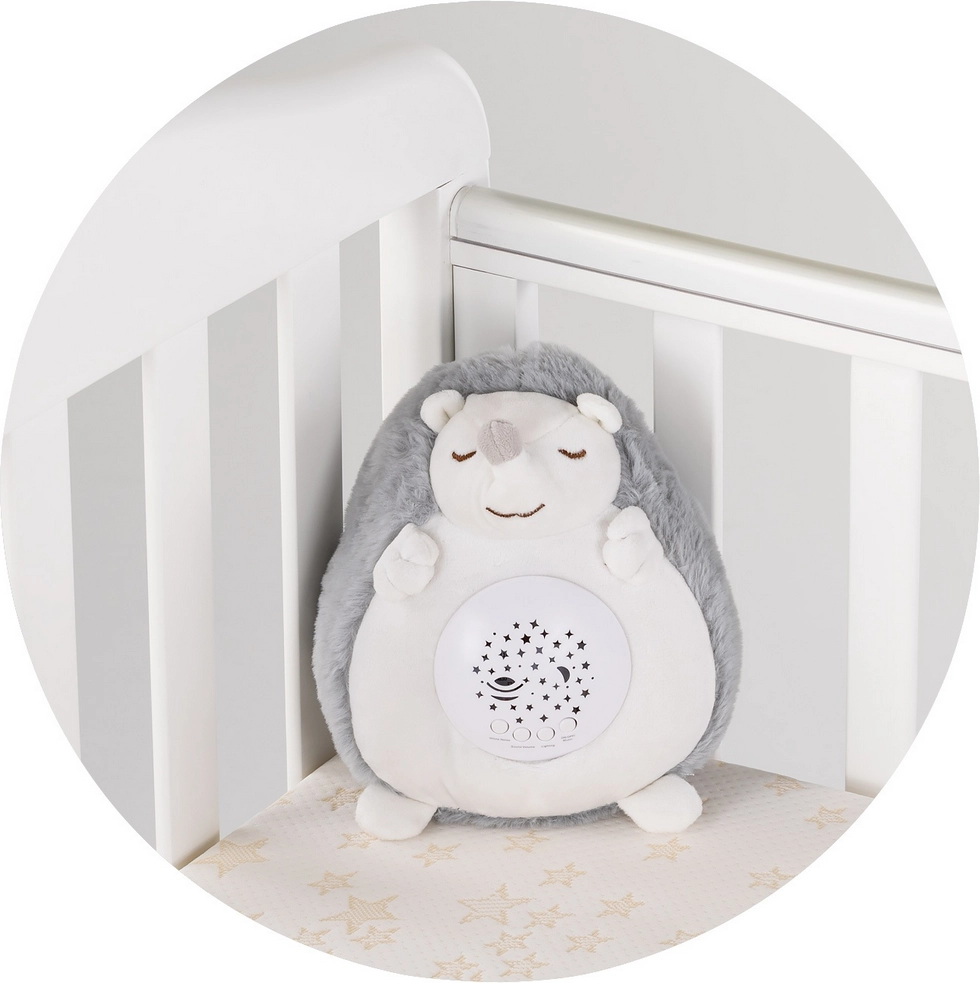Il morbido riccio di peluche crea un’atmosfera serena prima della nanna grazie al proiettore LED colorato con combinazioni di rosso, verde e blu, che si alternano delicatamente proiettando stelline nella stanza. Scegli tra 10 ninnananne o 5 tipi di rumore bianco (ad es. battito cardiaco, fruscio) e adatta il rituale serale all’umore del tuo bambino.